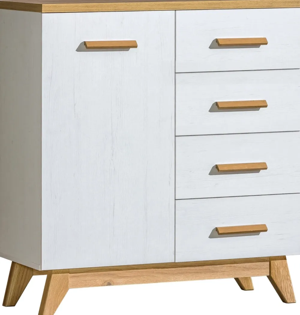 - Komoda z szufladami SILVA o szerokości 85 cm. Wyposażona została w 4 szuflady, oraz jedne drzwi, za którymi schowana jest jedna pojemna półka. Korpus i front wykonany z płyty laminowanej w wybarwieniu łączącym dwa kolory: dąb nash oraz sosna andersen.