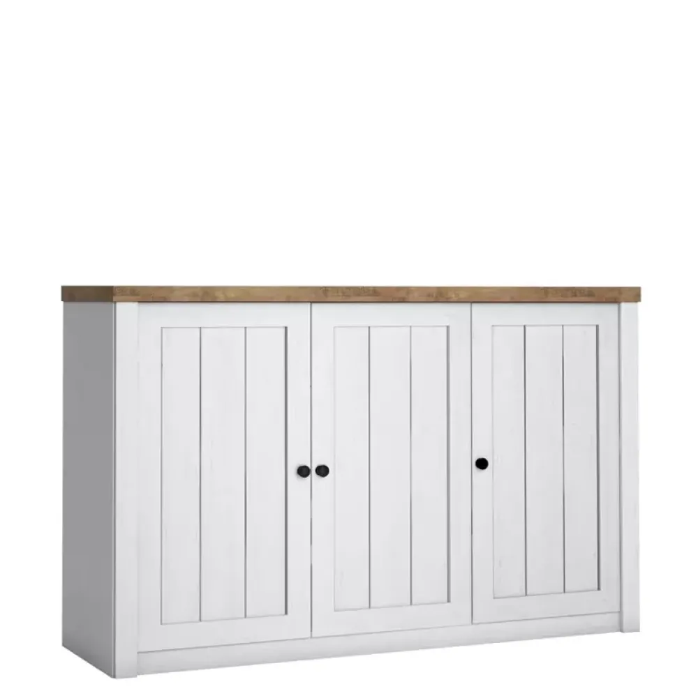 - Komoda PALAZO została wyposażona w trzy drzwi, za każdymi z nich znajduje się półka. Dodatkowo komoda posiada metalowe uchwyty oraz ryflowane fronty inspirujące do ponadczasowego stylu prowansalskiego.