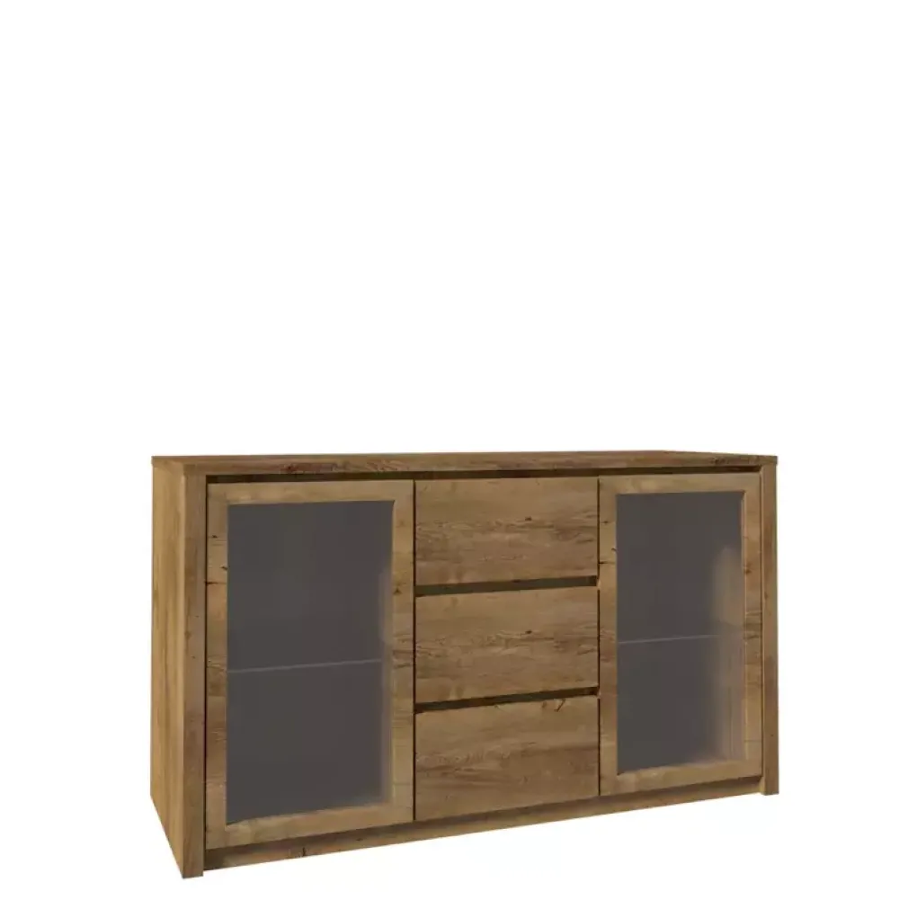 Komoda z witryną MERIZO to mebel który pozwoli ci znaleźć miejsce na rozmaite dekory oraz porcelanę. Posiada półkę za drzwiami po lewej oraz prawej stronie, natomiast w centralnej części mebla swoje miejsce znalazły trzy szuflady. Dodatkowo drzwi oraz szuflady otwierane są za pomocą systemu bezuchwytowego.