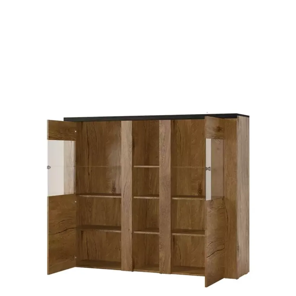 Prowansalski barek o szerokości 155 cm wyposażony w oszklone drzwiczki uchylne, za którymi znajdują się półki oraz otwarte półki pośrodku.