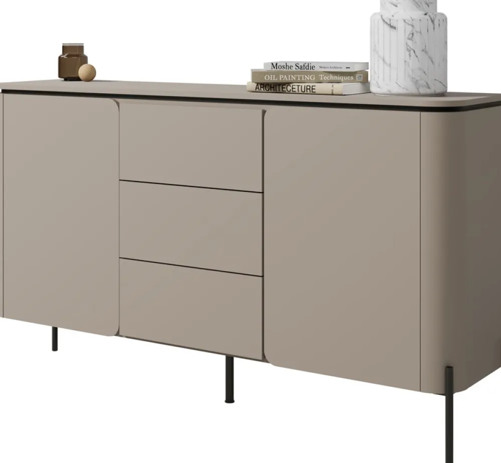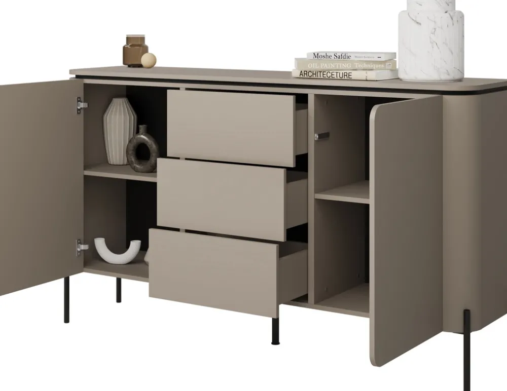 Komoda do salonu BELLO w modnym kolorze Congo to kwintesencja nowoczesnego minimalizmu i codziennej wygody. Jej zaokrąglone krawędzie, gładkie fronty i wysoka podstawa nadają jej lekkości i wyjątkowego charakteru. Dzięki przemyślanej konstrukcji, mebel oferuje zarówno estetykę, jak i praktyczne miejsce do przechowywania.