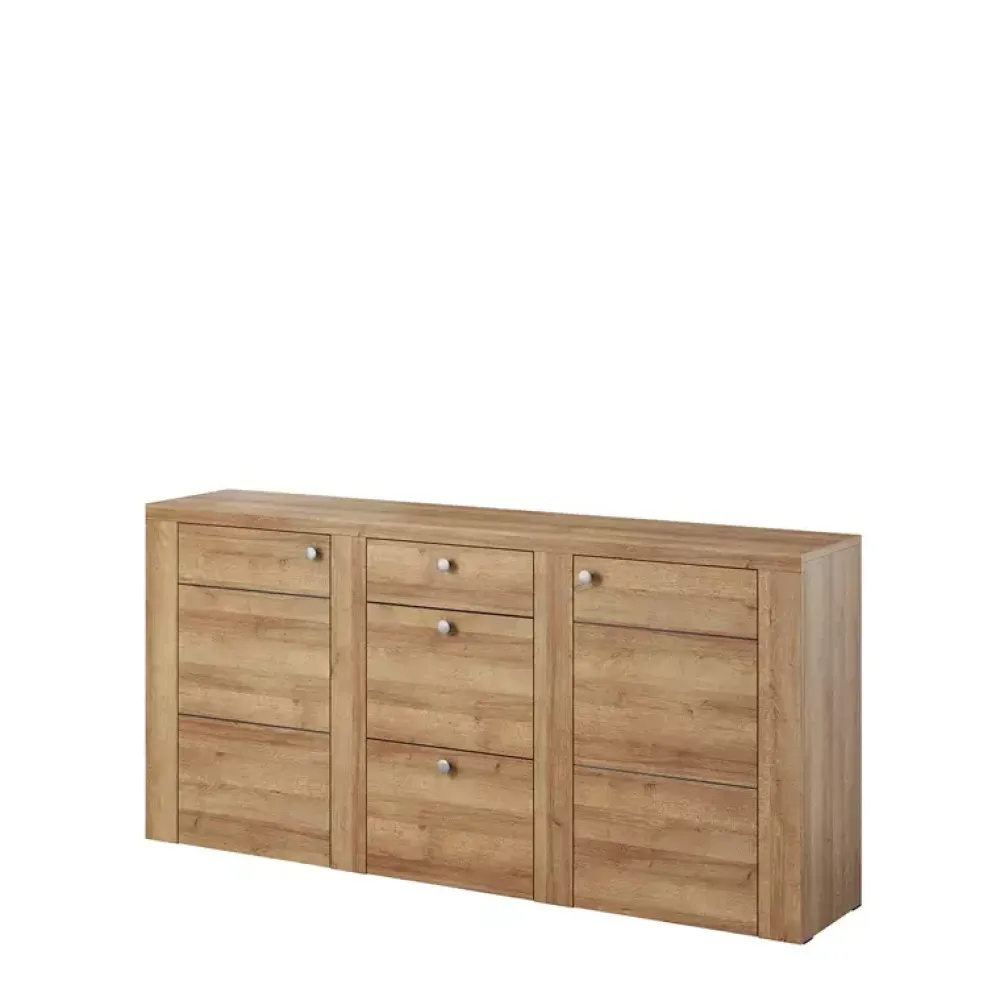 Pojemna komoda o szerokości 176 cm z dwiema parami drzwiczek uchylnych oraz trzema szufladami.