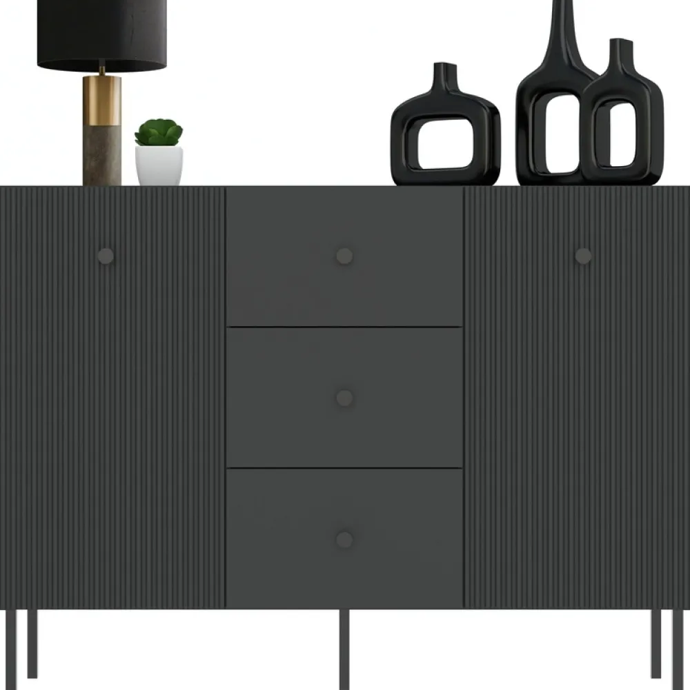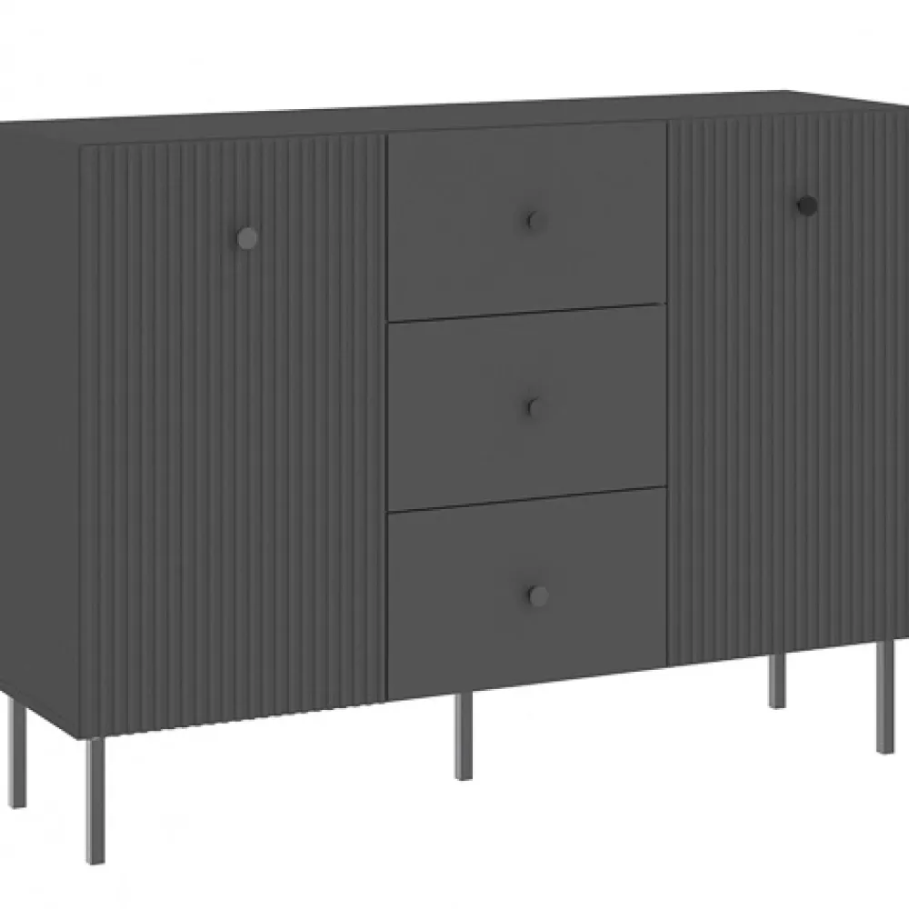 - Komoda VALTEO z dwiema szafkami i trzema szufladami to elegancki wybór do nowoczesnego salonu. Czarna kolorystyka, metalowe nóżki i trwałe materiały zapewniają styl, porządek i komfort użytkowania każdego dnia.