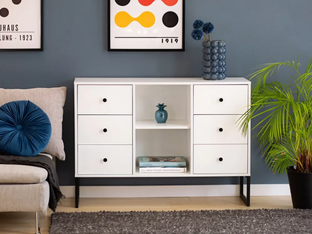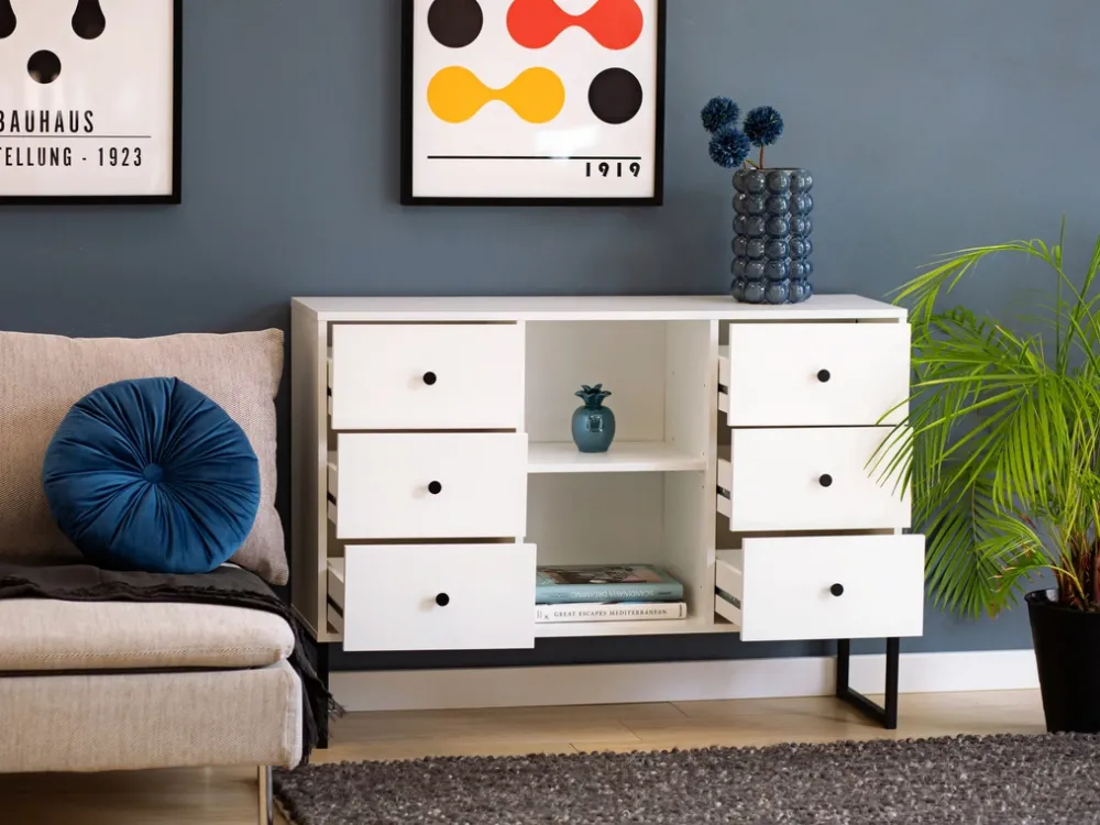 - Aż 6 szuflad i 2 półki – idealne na dokumenty, tekstylia i codzienne drobiazgi