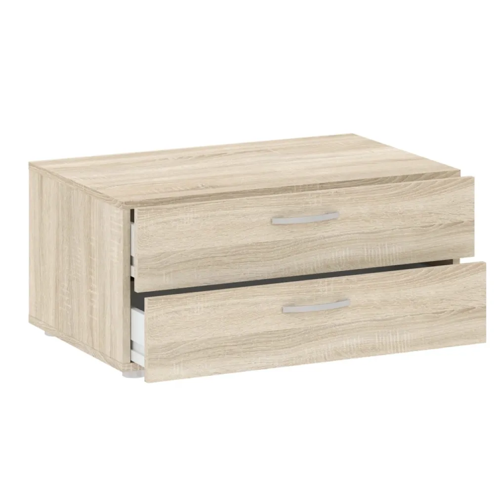 - Komoda BARENA 74 cm to kompaktowy mebel z dwiema szufladami, idealny do sypialni lub salonu. Łączy nowoczesny design z praktycznym przechowywaniem. Prowadnice kulkowe, matowe wykończenie i nóżki w kolorze dąb sonoma tworzą funkcjonalną całość.