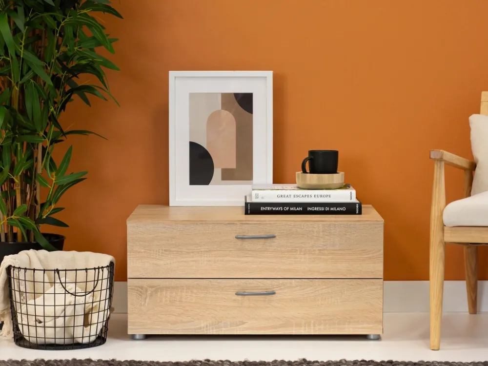 Szukasz funkcjonalnego mebla do przechowywania, który nie zajmie zbyt wiele miejsca? Komoda 74 cm do sypialni BARENA łączy minimalistyczny design z codzienną praktycznością. Dzięki dwóm pojemnym szufladom idealnie sprawdzi się jako podręczny schowek na bieliznę, kosmetyki czy dokumenty – zarówno w sypialni, jak i pokoju dziennym.