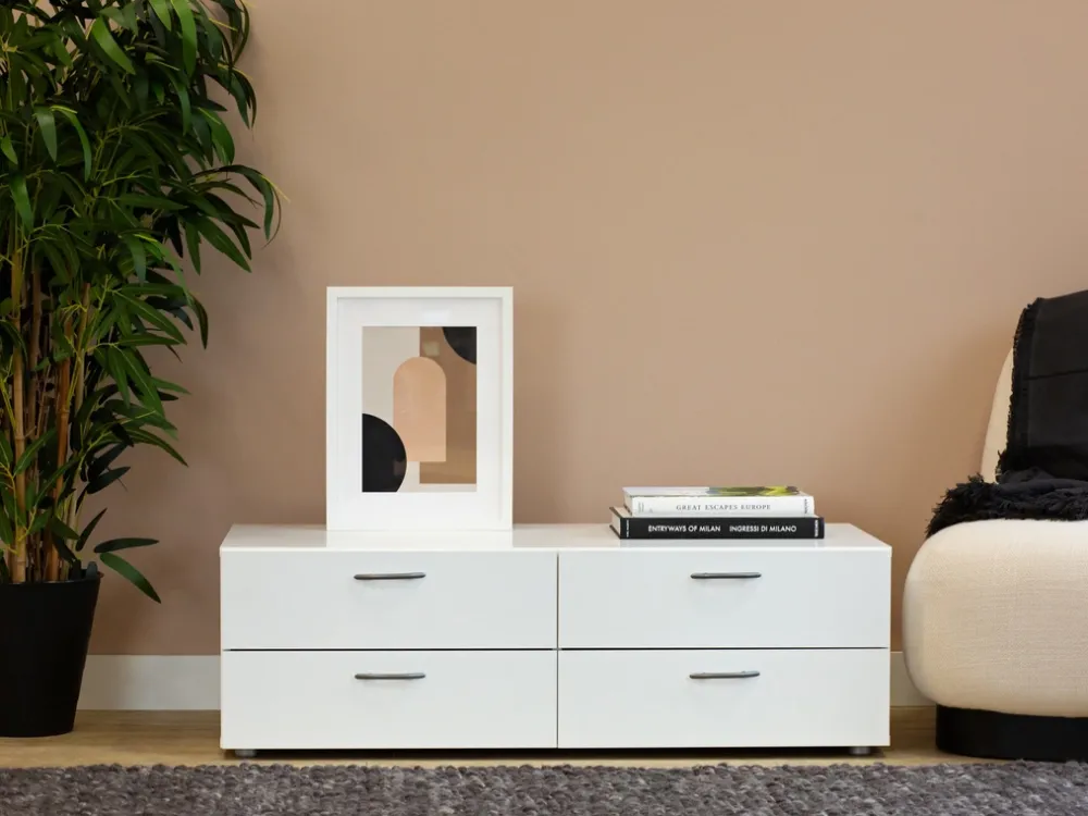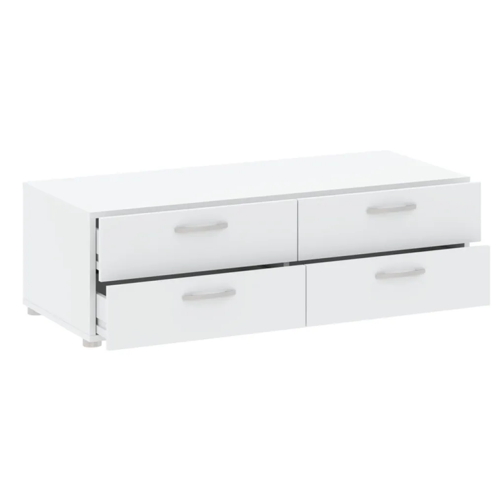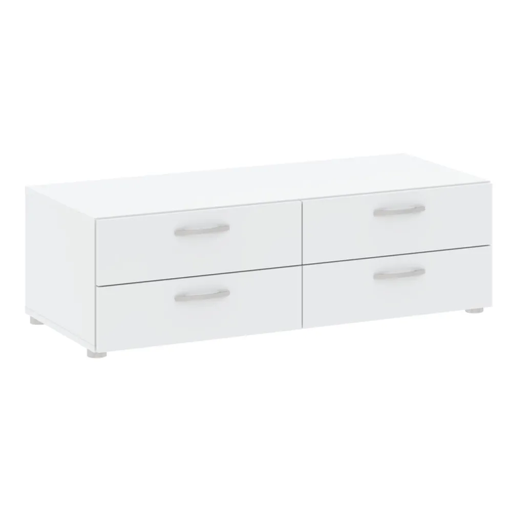 - Komoda 110 cm BARENA do sypialni i salonu w białym macie. Cztery szuflady na prowadnicach kulkowych zapewniają wygodne przechowywanie. Kompaktowa, nowoczesna komoda idealna do małych wnętrz – styl i funkcjonalność na co dzień.