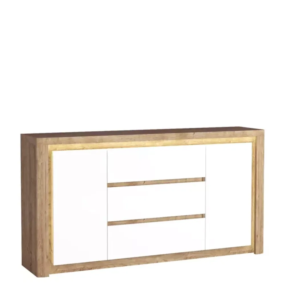 Komoda LANES to nowocześnie wykonana propozycja, która dzięki swojej stylistyce odnajduje swoje miejsce we współczesnych aranżacjach salonów. Komoda posiada trzy szuflady w swojej centralnej części oraz po dwie szafki po bokach, w każdej z szafek znajduje się półka.