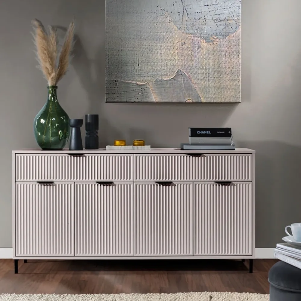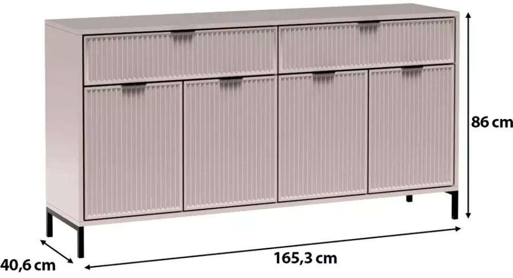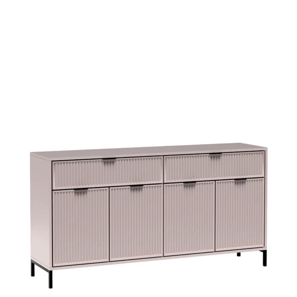 - Nowoczesna komoda LATINA w kolorze kaszmiru, wykończona ryflowanymi frontami, to znakomity dodatek do każdego wnętrza. Cztery drzwi i dwie szuflady gwarantują praktyczność, podczas gdy jej elegancki design przyciąga wzrok.