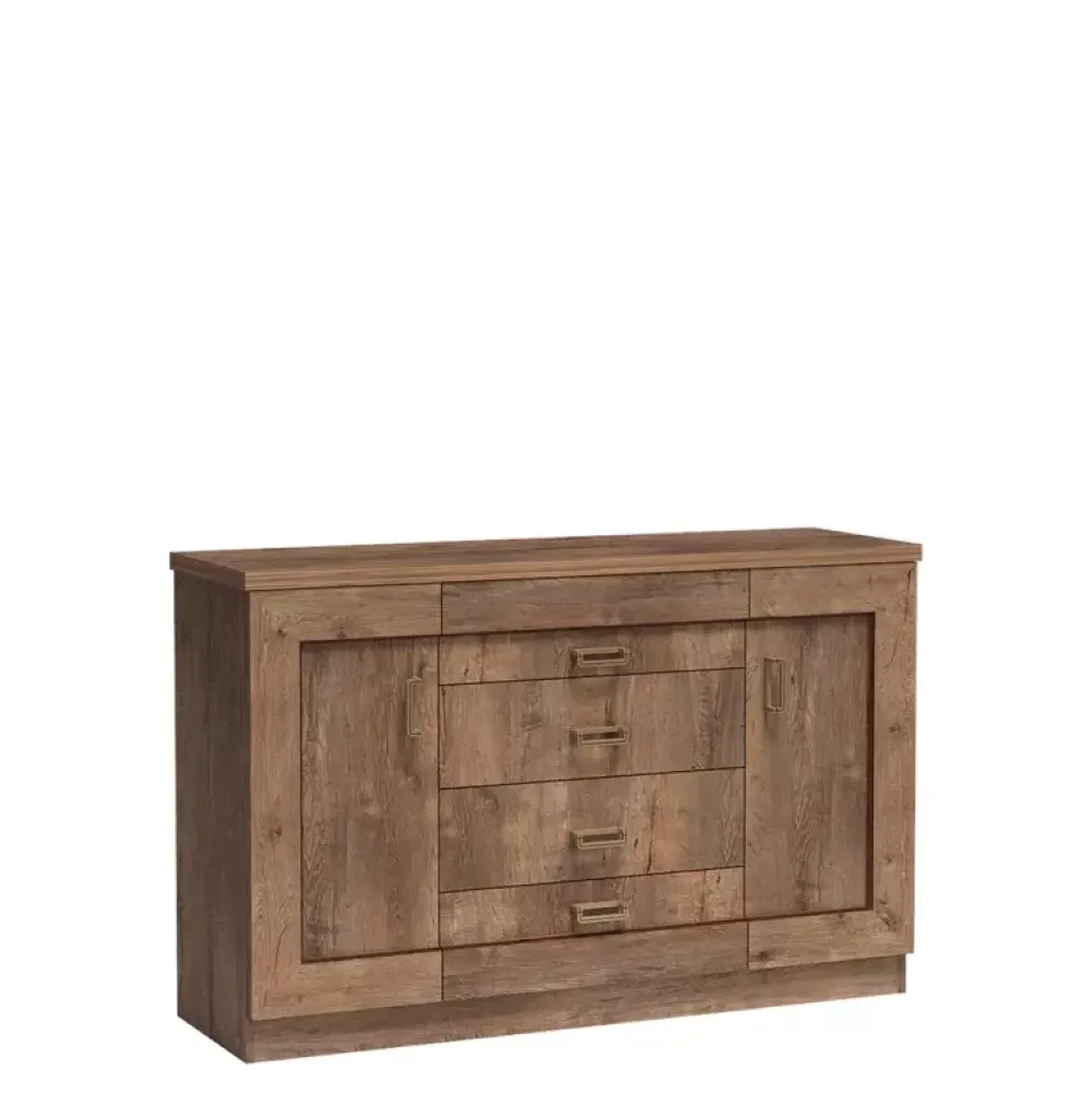 Komoda TAVIER jest propozycją, która dzięki wykonaniu w klasycznej stylistyce doskonale sprawdza się w klasycznych aranżacjach pomieszczeń nadając im niepowtarzalnych oraz eleganckich akcentów. Komoda została wyposażona w cztery pojemne szuflady oraz parę drzwi, za którymi znajdują się obszerne półki gotowe pomieścić rozmaite akcesoria oraz ubrania.