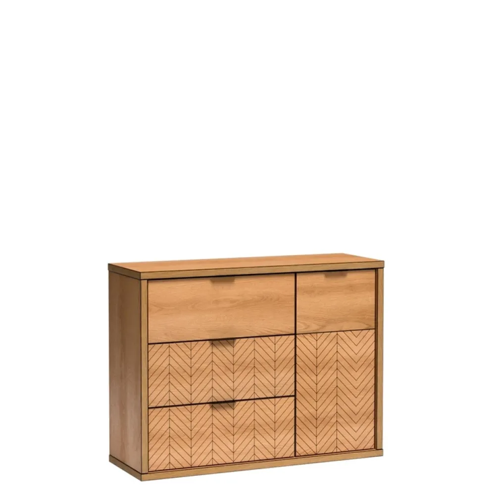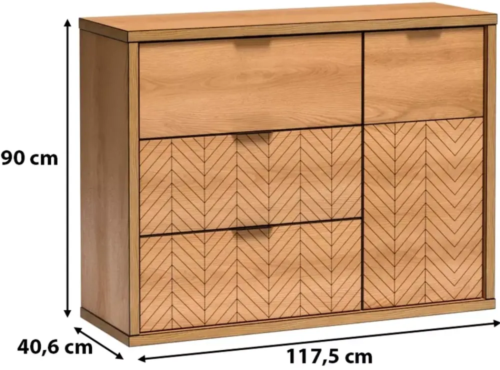 - Odkryj elegancję z naszą komodą FONETTI do salonu w dębie karmel. Trzy szuflady i jedne drzwi zapewniają funkcjonalność, a frezowany wzór czarnej jodełki na frontach dodaje unikalnego stylu. Przemyślana estetyka spotyka się z praktycznością.