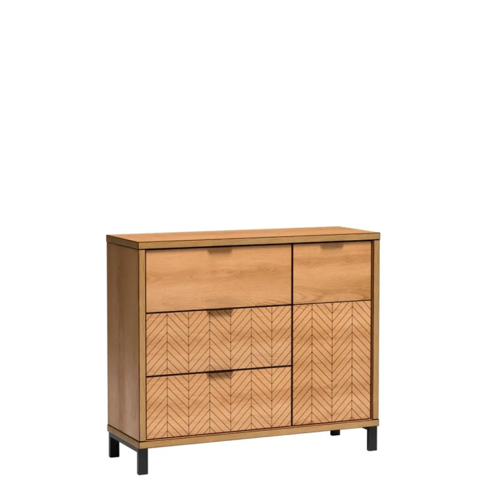 To, co naprawdę wyróżnia tę komodę, to jej wyjątkowy frezowany wzór na frontach w postaci czarnej jodełki. Ten szczegółowy i intrygujący design dodaje meblowi charakteru, czyniąc go nie tylko funkcjonalnym, ale również ozdobnym elementem każdego pomieszczenia.