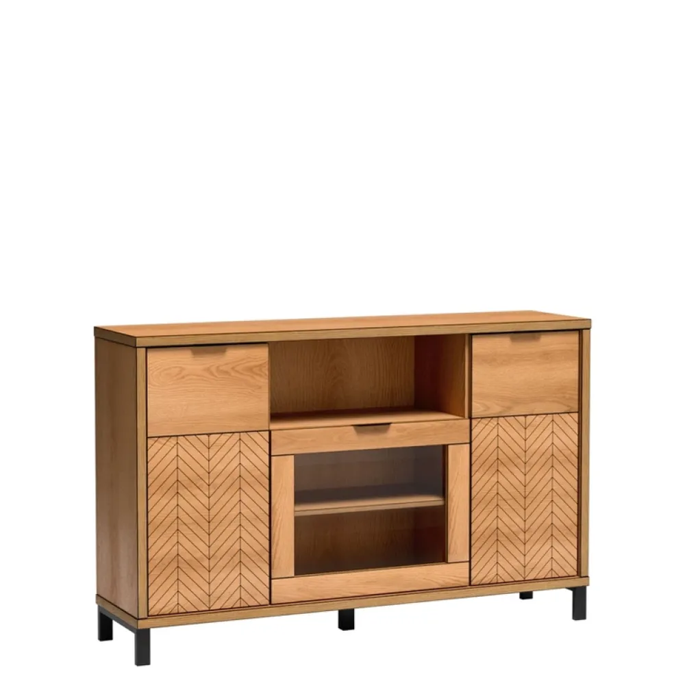 Serdecznie witające centrum komody gwarantuje szafkę z przeszklonym frontem, której wnętrze zdobi półka dzieląca przestrzeń na pół. Idealna do prezentacji ulubionych książek, pamiątek, czy ozdobnych elementów – miejsce, które stanie się naturalnym punktem przyciągającym wzrok w salonie.