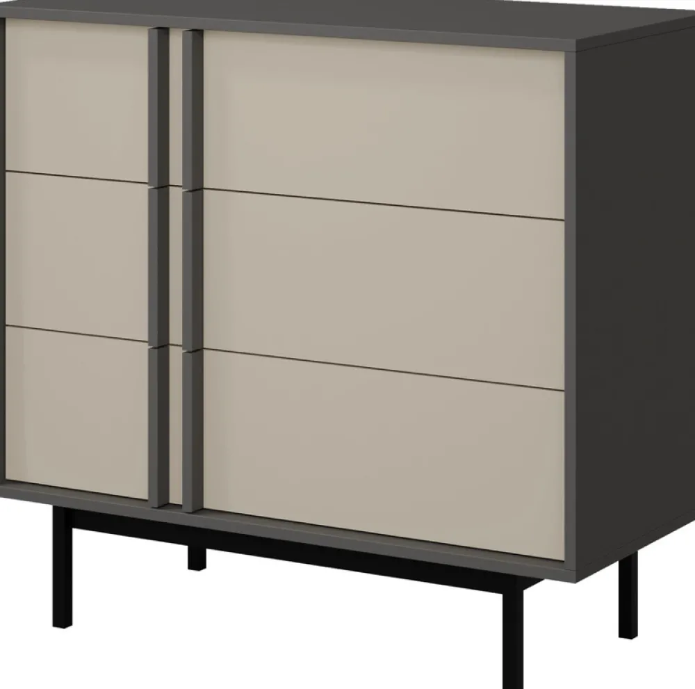 Elegancka i praktyczna komoda AVERO o szerokości 93 cm i wysokości 87 cm to mebel idealny do nowoczesnego salonu, sypialni, przedpokoju lub gabinetu. Wyjątkowe zestawienie modnych kolorów – głębokiego antracytu z delikatnym beżem – nadaje wnętrzu stylowego i harmonijnego charakteru.