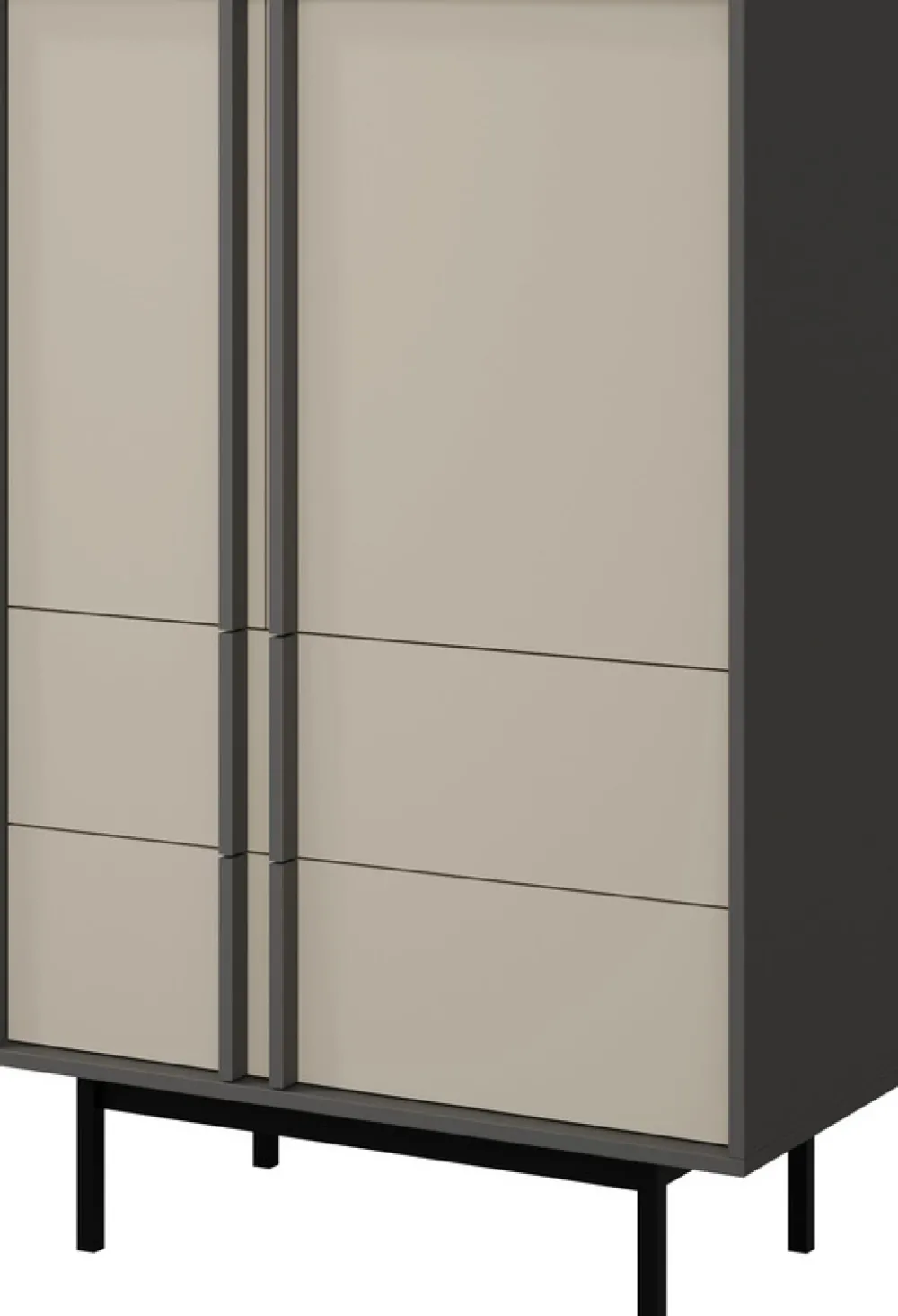 - Nowoczesna komoda wysoka AVERO o wysokości 127 cm w kolorze antracyt z frontami w jasnym beżu. Wyposażona w dwie szafki z półkami oraz dwie szuflady na prowadnicach kulkowych. Stabilne czarne metalowe nóżki dodają meblowi lekkości i stylu.