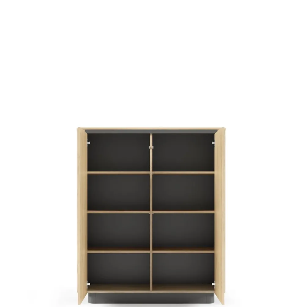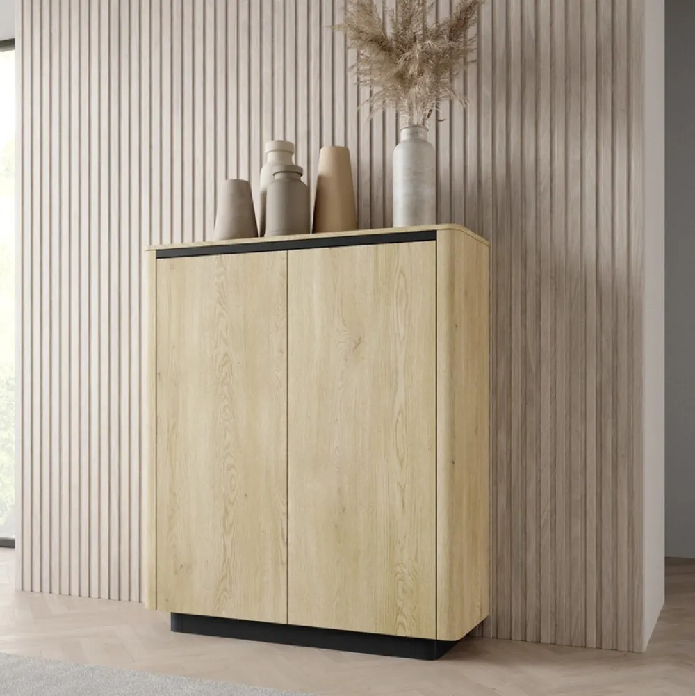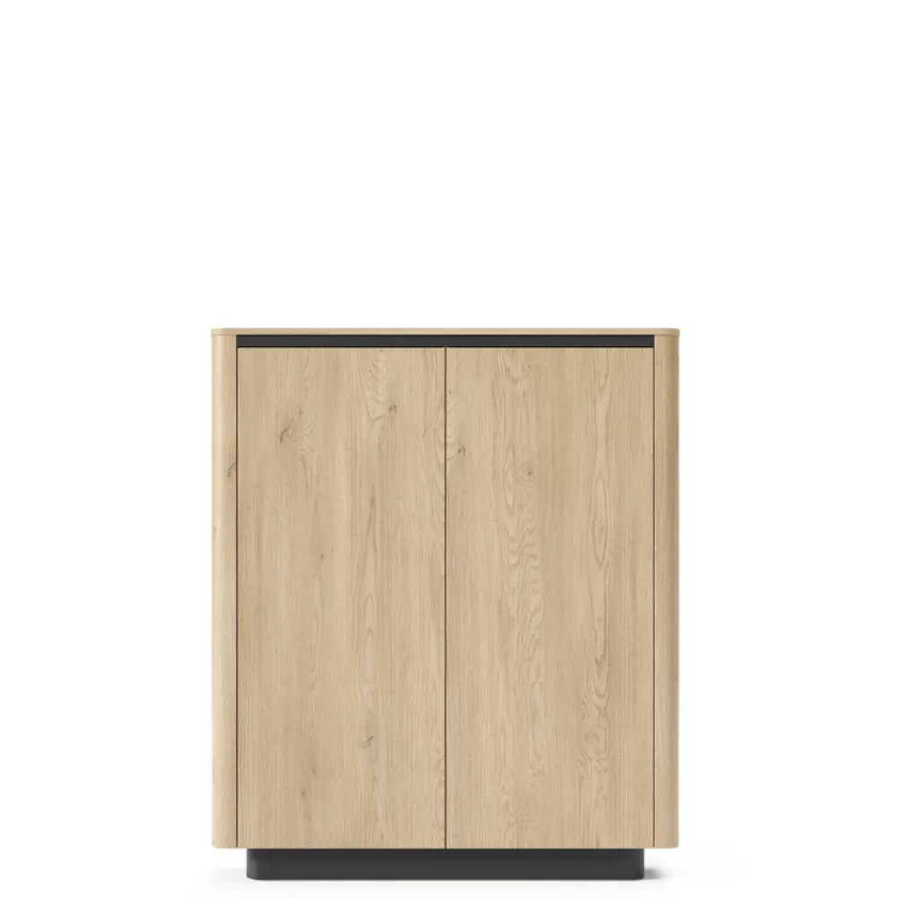 Komoda zamykana w dekorze dąb cremona z czarnymi akcentami to idealny wybór do nowoczesnych wnętrz. Jej funkcjonalna forma mieści aż osiem przestronnych półek za eleganckimi drzwiczkami bez uchwytów. System push-to-open zapewnia wygodę użytkowania, a zaoblone listwy MDF i czarny cokół dodają całości designerskiego sznytu.