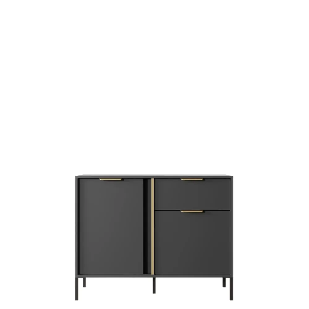 - Komoda LECCE w kolorze antracyt z dwoma drzwiami i jedną szufladą. Posiada ona piękne ozdobne złote uchwyty, oraz złotą okleinę pośrodku, dzięki czemu jest bardzo nowoczesnym meblem.
