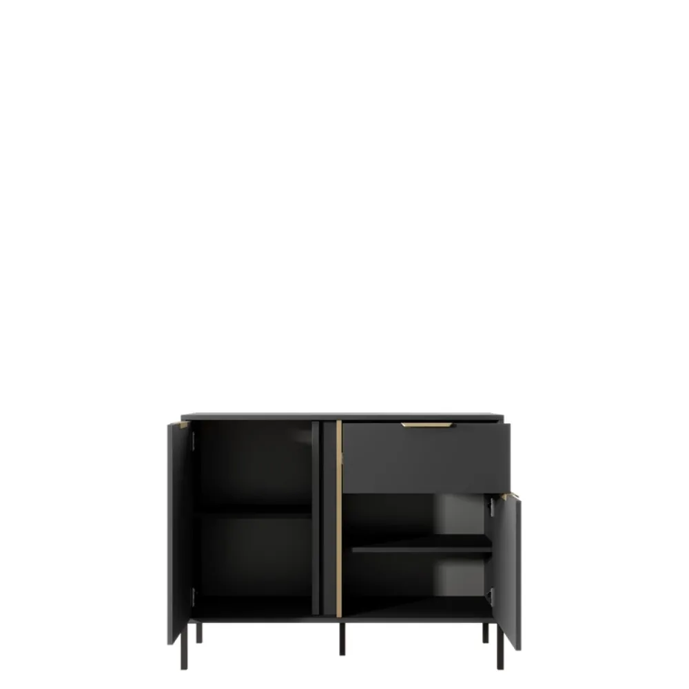 Design komody został podkreślony przez zastosowanie złotych metalowych krawędziowych uchwytów oraz dekoracyjnej złotej okleiny ABS, która przebiega pośrodku mebla. Dzięki temu połączeniu kolorystycznemu mebel zyskuje dodatkowego blasku i prestiżu.