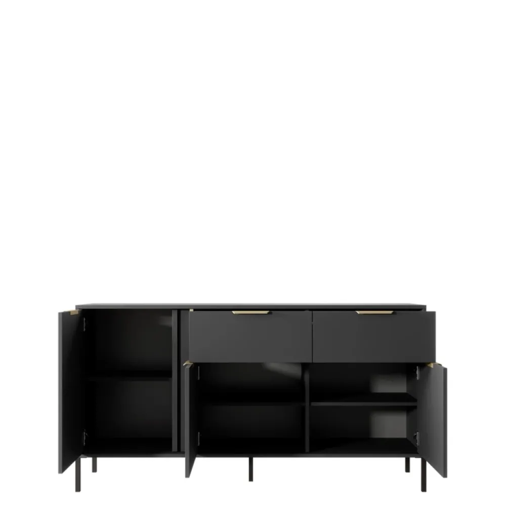 - Ta nowoczesna komoda do salonu LECCE ma szerokość 153 cm. Posiada trzy drzwi z oraz dwie szuflady. Ma również dekoracyjną złotą okleinę ABS, krawędziowe złote uchwyty oraz stoi na pięciu czarnych nóżkach.