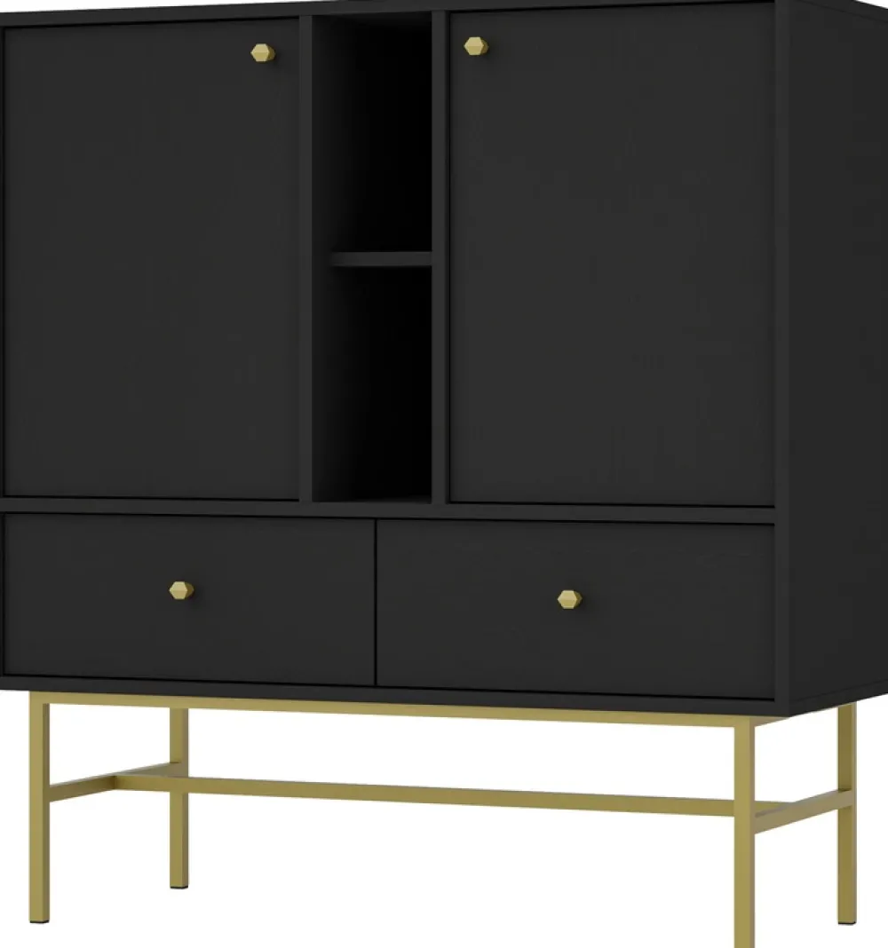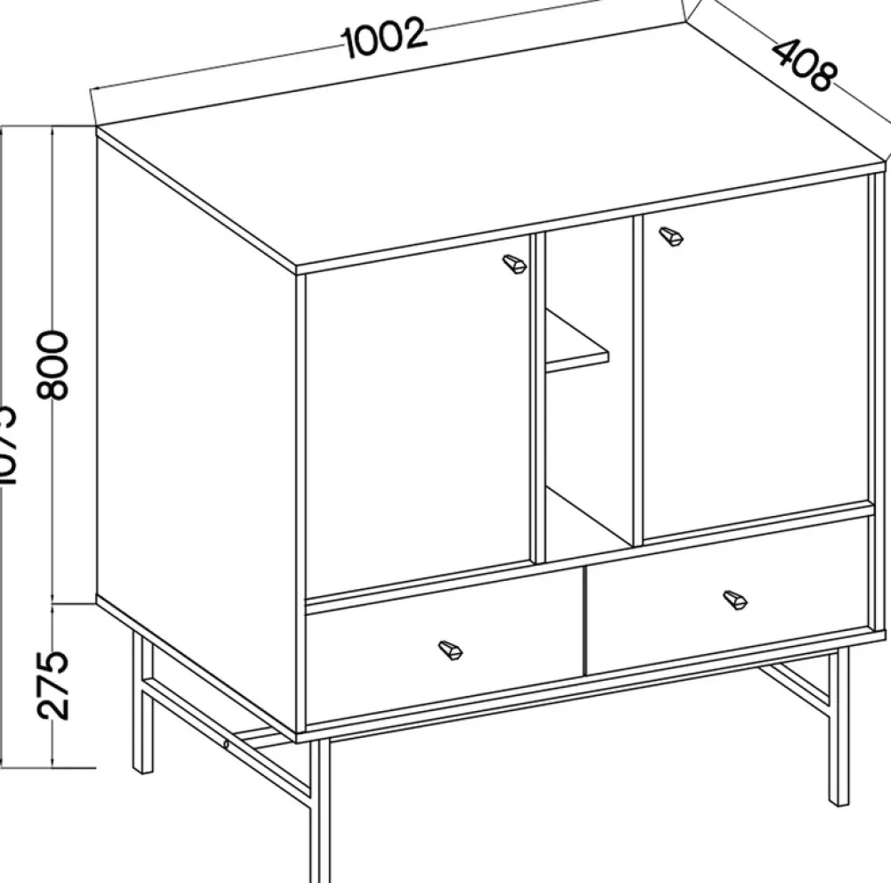 Po lewej i prawej stronie komody znajdują się drzwi, za którymi kryje się przestronna półka. To idealne miejsce na przechowywanie większych przedmiotów, takich jak dokumenty, książki czy różne akcesoria domowe. W centralnej części komody znajdują się dwie otwarte półki, które mogą służyć do ekspozycji ulubionych dekoracji, zdjęć lub sprzętu elektronicznego. Dzięki temu zyskujesz łatwy dostęp do często używanych przedmiotów.