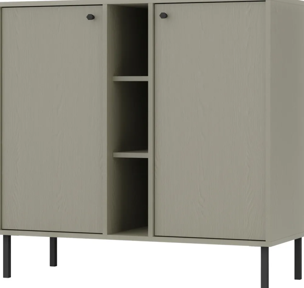 Komoda została zaprojektowana z myślą o maksymalnym wykorzystaniu przestrzeni. Składa się z dwojga drzwi, za którymi znajdują się pojemne półki, idealne do przechowywania wszelkiego rodzaju przedmiotów, od książek po dekoracje. Pomiędzy drzwiami znajduje się otwarta przegroda z dwiema półkami, która nie tylko dodaje uroku, ale także pozwala na wyeksponowanie ulubionych ozdób czy sprzętu RTV.