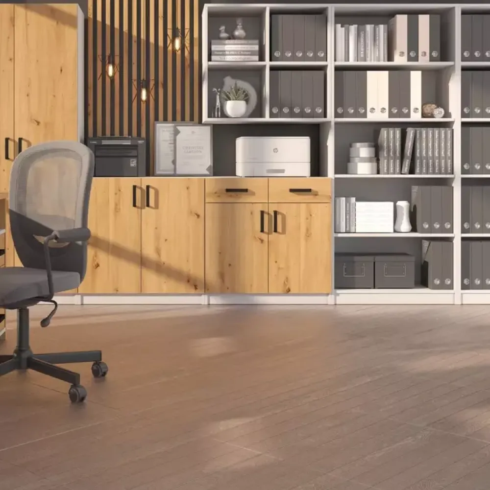 Komoda biurowa MULL ma 79,9 cm szerokości i wyposażono ją w cztery wnęki. Mała komoda sprawdzi się nie tylko w biurze, ale też w innych pomieszczeniach w stylu loftowym, czy nowoczesnym. Jasny szary w połączeniu z dekorem dąb artisan wpasuje się w wiele aranżacji.