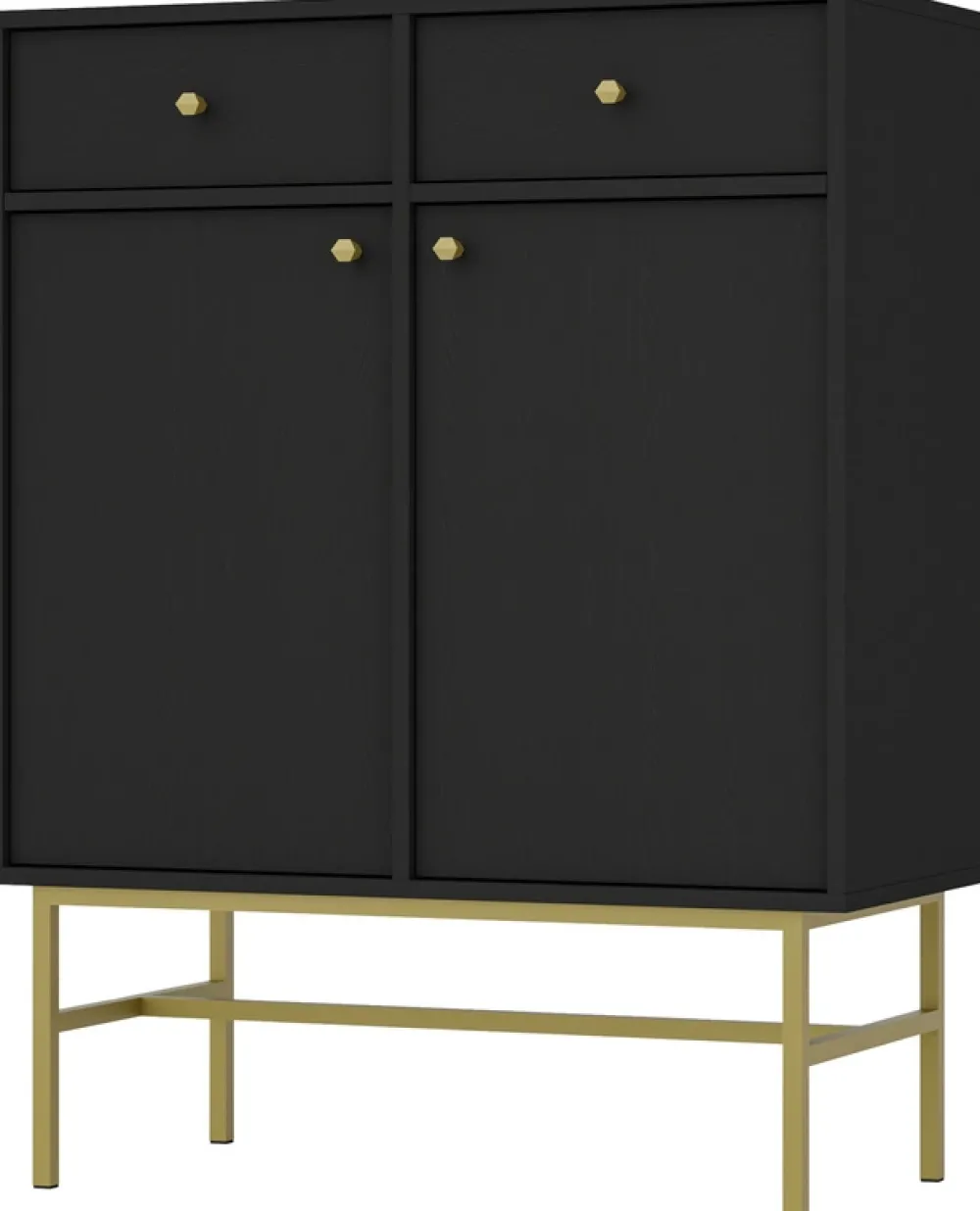 - Komoda do salonu 84 cm TOKEN posiada dwie szuflady u góry osadzone na prowadnicach kulkowych, pod szufladami znajdują się drzwi, a za każdymi z nich jedna półka. Uchwyty oraz nóżki w formie stelaża wykonano z metalu. Obrzeża wykończone okleiną ABS.