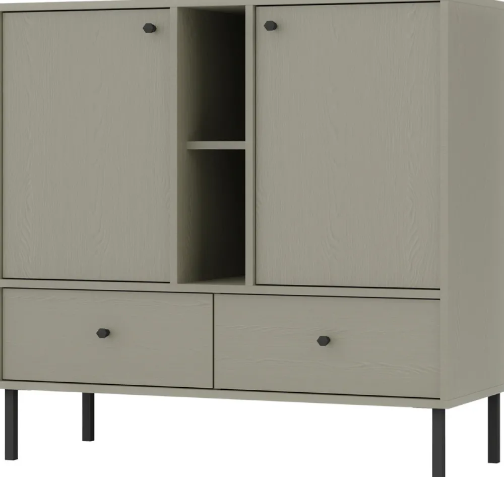 Między drzwiami umieszczona jest otwarta przegroda, która zawiera dwie funkcjonalne półki. To miejsce stworzone do wyeksponowania dekoracji, książek czy sprzętu RTV. Otwarta konstrukcja dodaje lekkości i nowoczesnego charakteru komodzie, sprawiając, że świetnie wkomponuje się w każdy styl wnętrza.