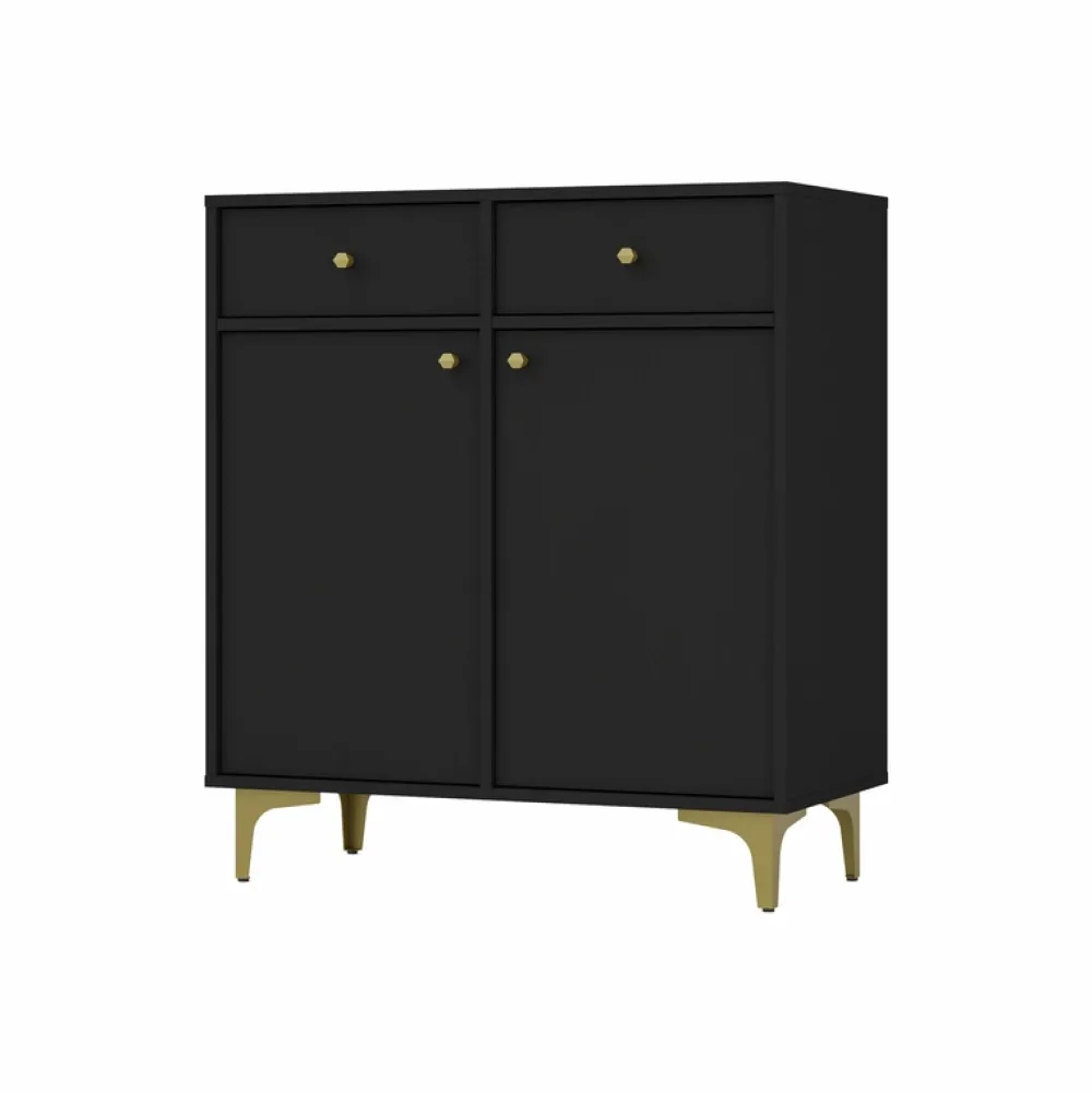 - Komoda do salonu 84 cm TOKEN posiada dwie głębokie szuflady u góry które osadzono na prowadnicach kulkowych. Poniżej znajdują się drzwi, za każdymi z nich zastosowano jedną półkę. Uchwyty i nóżki o wysokości 13,5 cm wykonano z metalu.