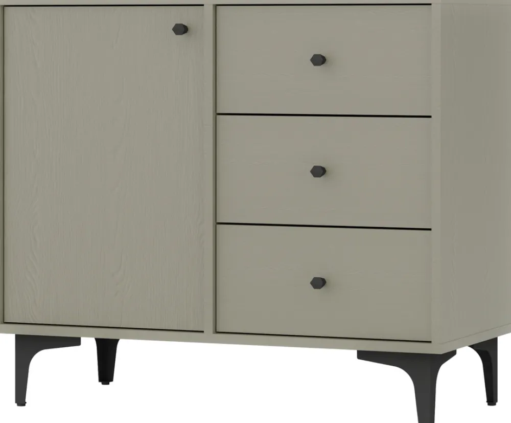Po prawej stronie komody znajdują się trzy szuflady osadzone na prowadnicach kulkowych. Dzięki temu otwieranie i zamykanie szuflad jest płynne i bezproblemowe. Szuflady są idealne do przechowywania drobiazgów, które chcesz mieć zawsze pod ręką, ale niekoniecznie na widoku. Organizacja przestrzeni jeszcze nigdy nie była tak prosta!