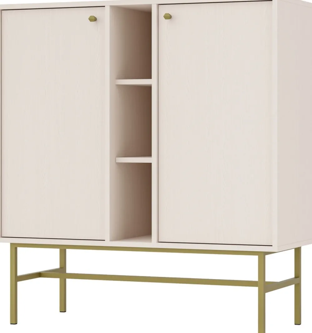 - Komoda do salonu 100 cm TOKEN posiada parę drzwi, za każdymi z nich znajduje się jedna półka. Dodatkowo komoda posiada dwie otwarte półki pomiędzy drzwiami, które sprawdzą się do rozmieszczenia akcesoriów i dekoracji. Nogi i uchwyty wykonano z metalu.