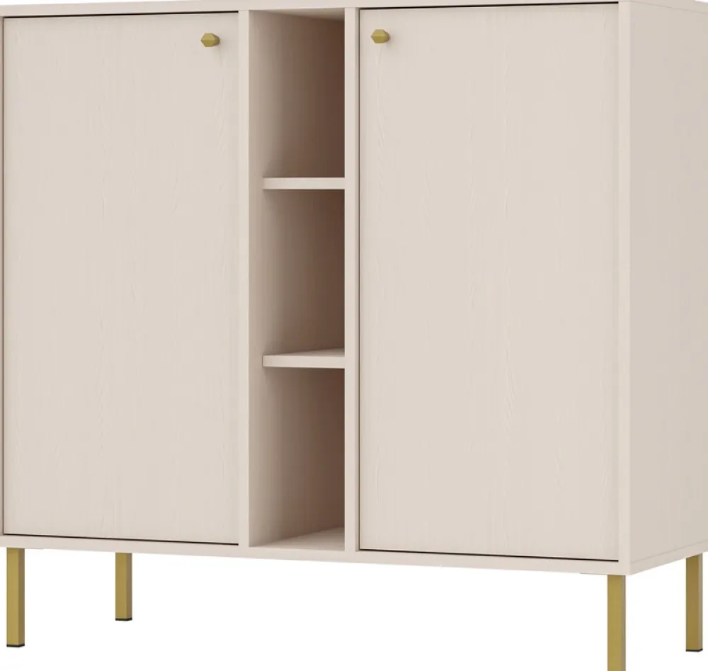 Komoda została zaprojektowana z myślą o maksymalnym wykorzystaniu przestrzeni. Składa się z dwojga drzwi, za którymi znajdują się pojemne półki, idealne do przechowywania wszelkiego rodzaju przedmiotów, od książek po dekoracje. Pomiędzy drzwiami znajduje się otwarta przegroda z dwiema półkami, która nie tylko dodaje uroku, ale także pozwala na wyeksponowanie ulubionych ozdób czy sprzętu RTV.