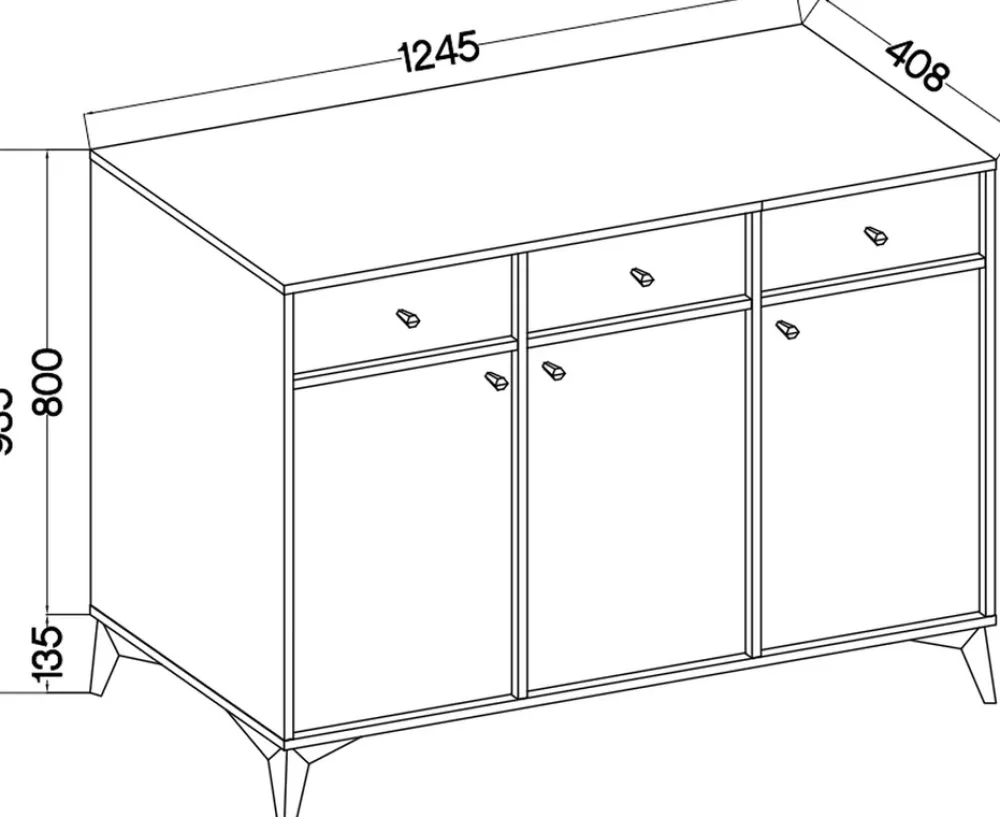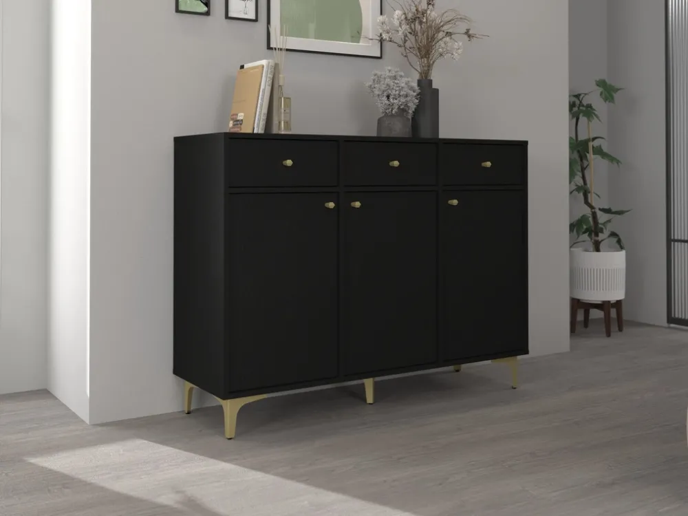 Pod szufladami znajdują się trzy drzwi, za którymi kryją się półki. Każda sekcja jest wyposażona w półkę, co pozwala na uporządkowane przechowywanie większych przedmiotów, takich jak książki, zastawa stołowa czy tekstylia. Dzięki temu z łatwością utrzymasz porządek w swoim salonie.