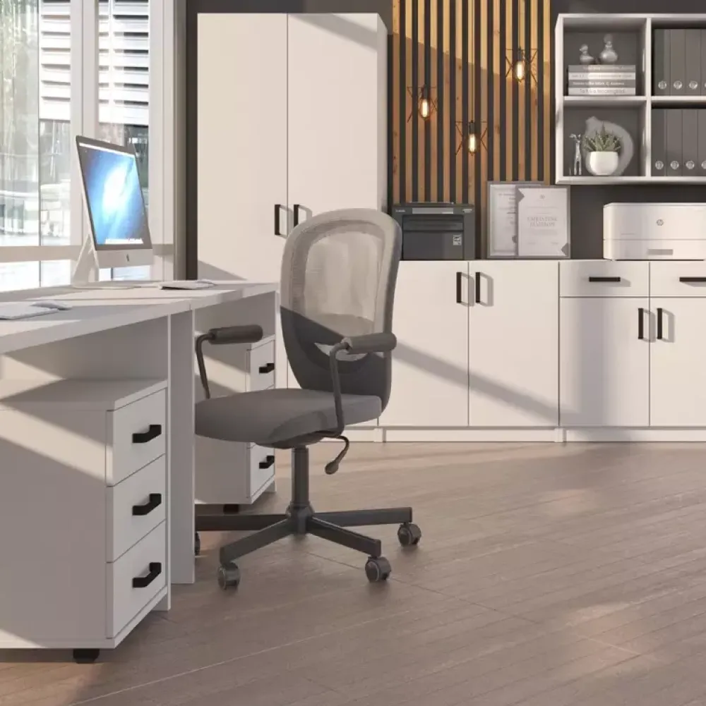Komoda biurowa MULL ma 79,9 cm szerokości i wyposażono ją w cztery wnęki. Mała komoda sprawdzi się nie tylko w biurze, ale też w innych pomieszczeniach w stylu loftowym, czy nowoczesnym. Jasny szary kolor mebla wpasuje się w wiele aranżacji.