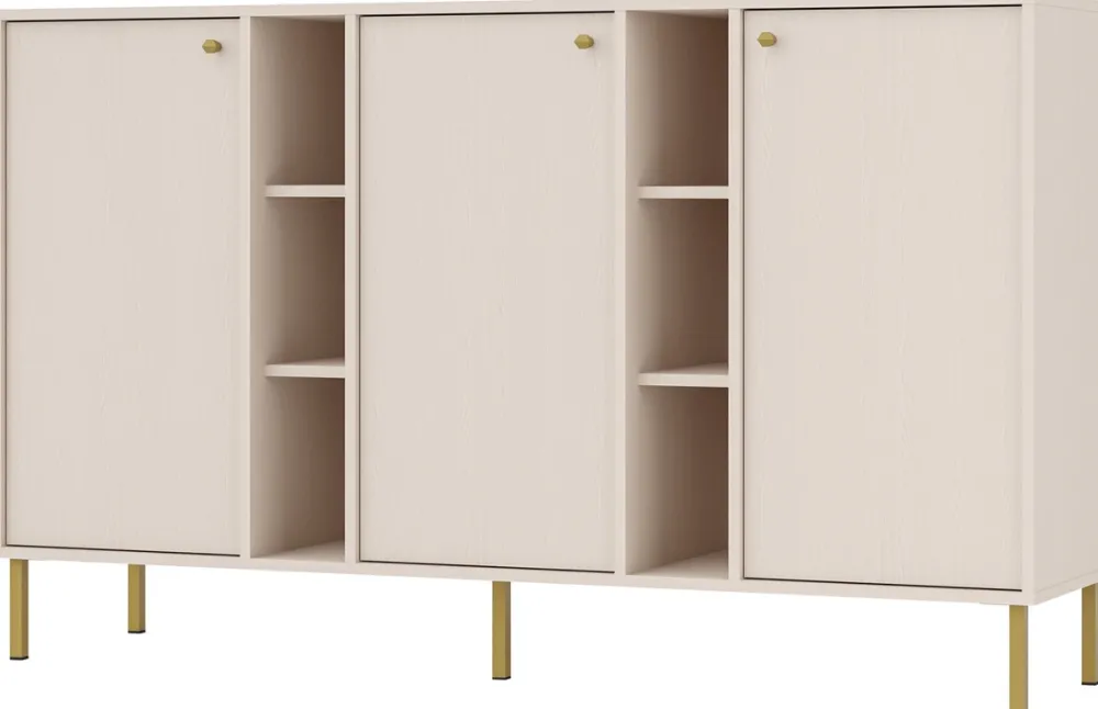 Nasza komoda do salonu została zaprojektowana z myślą o nowoczesnym wystroju wnętrz. Wyposażona w trzy drzwi, za każdymi z nich znajduje się pojemna półka, która umożliwia wygodne przechowywanie różnych przedmiotów. Dodatkowo komoda posiada dwie otwarte przegrody, każda z nich wyposażona w dwie półki, co sprawia, że jest idealna do eksponowania książek, dekoracji czy sprzętu RTV.