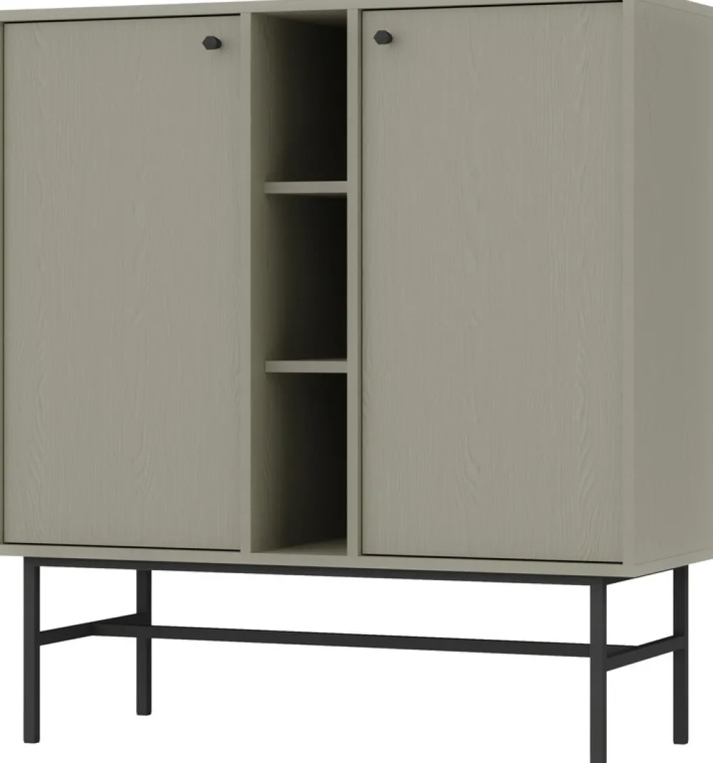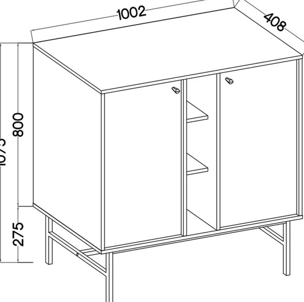 - Komoda do salonu 100 cm TOKEN posiada parę drzwi, za każdymi z nich znajduje się jedna półka. Dodatkowo komoda posiada dwie otwarte półki pomiędzy drzwiami, które sprawdzą się do rozmieszczenia akcesoriów i dekoracji. Nogi i uchwyty wykonano z metalu.