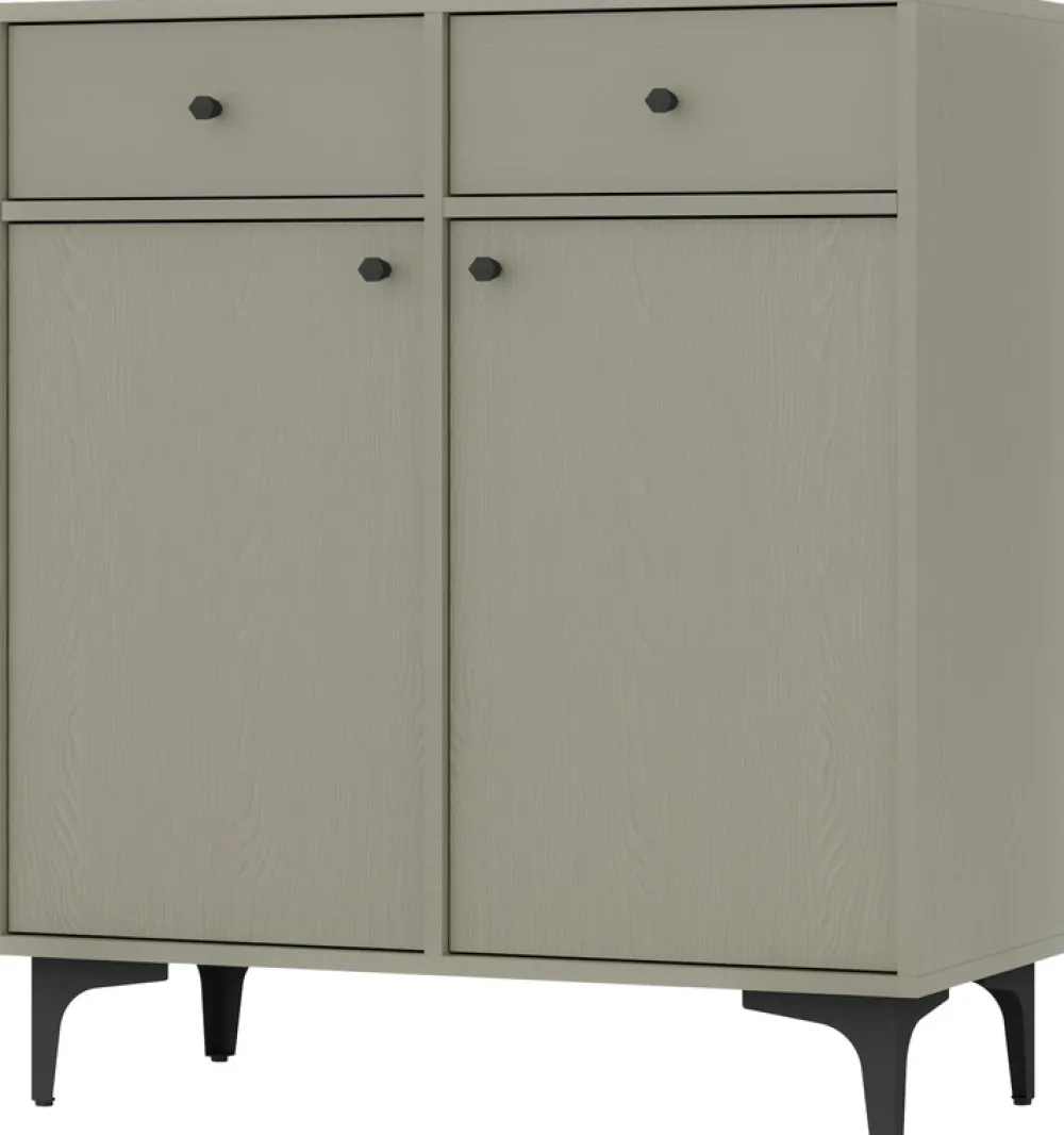- Komoda do salonu 84 cm TOKEN posiada dwie szuflady osadzone na prowadnicach kulkowych u góry, oraz parę drzwi poniżej, za każdymi z nich znajduje się jedna półka. Komoda posiada metalowe uchwyty i nóżki o wysokości 13,5 cm.