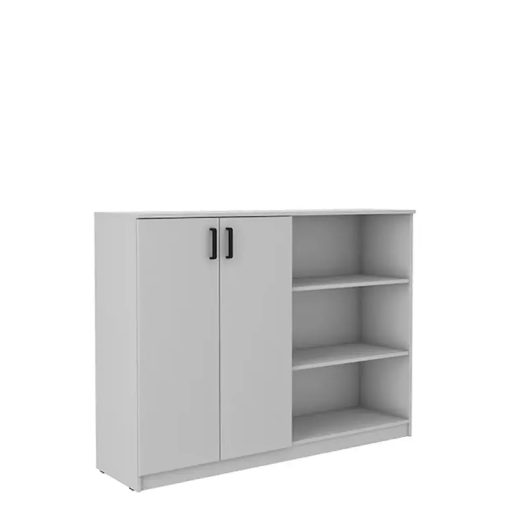 Komoda biurowa MULL ma 158 cm szerokości i wyposażono ją w cztery praktyczne półki, spośród których dwie znajdują się za drzwiczkami uchylnymi. Komoda sprawdzi się do przechowywania teczek z dokumentami, ponieważ wysokości między półkami wynoszą od 33 do 35 cm.