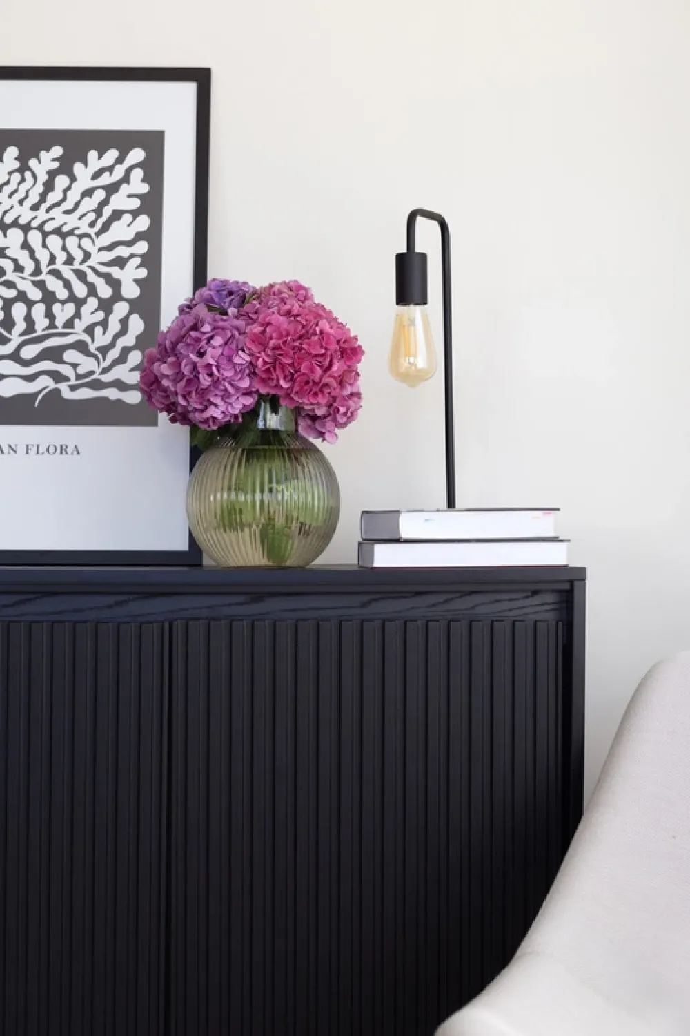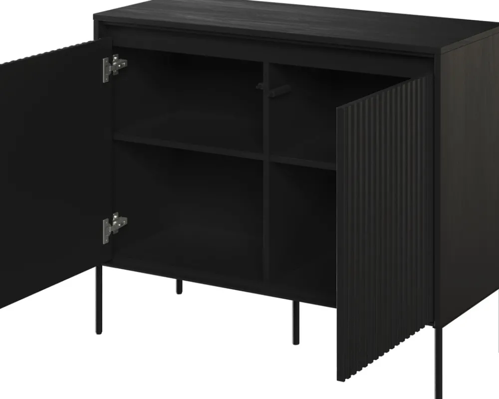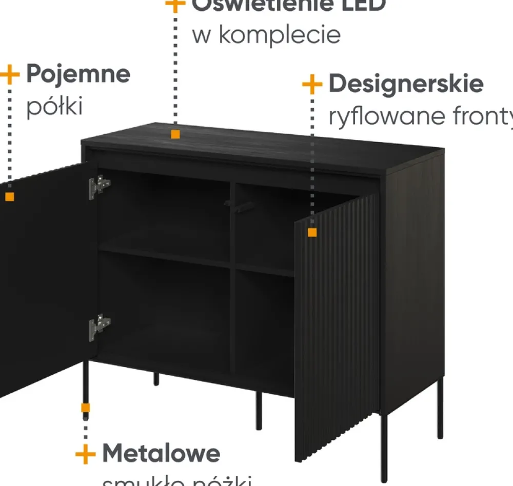Frezowane fronty o prostym kształcie wykonane z płyty MDF o grubości 18 mm tworzą unikalny wzór półwałka, który nadaje meblowi wyrazistej, trójwymiarowej głębi. Ten subtelny, a jednocześnie zdecydowany design idealnie komponuje się z czarnym wykończeniem, tworząc niezapomniane wrażenie.