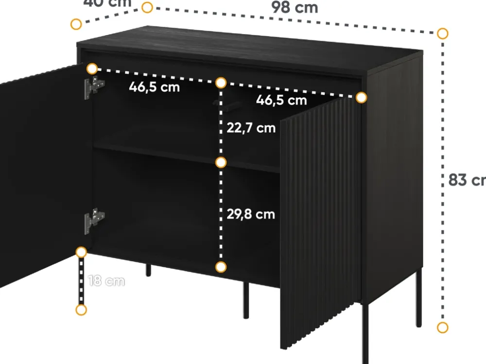 Podsumowując, nasza czarna komoda dwudrzwiowa jest synonimem elegancji i funkcjonalności. Idealnie łączy w sobie nowoczesny design z praktycznymi rozwiązaniami, tworząc idealny mebel dla tych, którzy szukają czegoś więcej niż tylko przestrzeni do przechowywania.