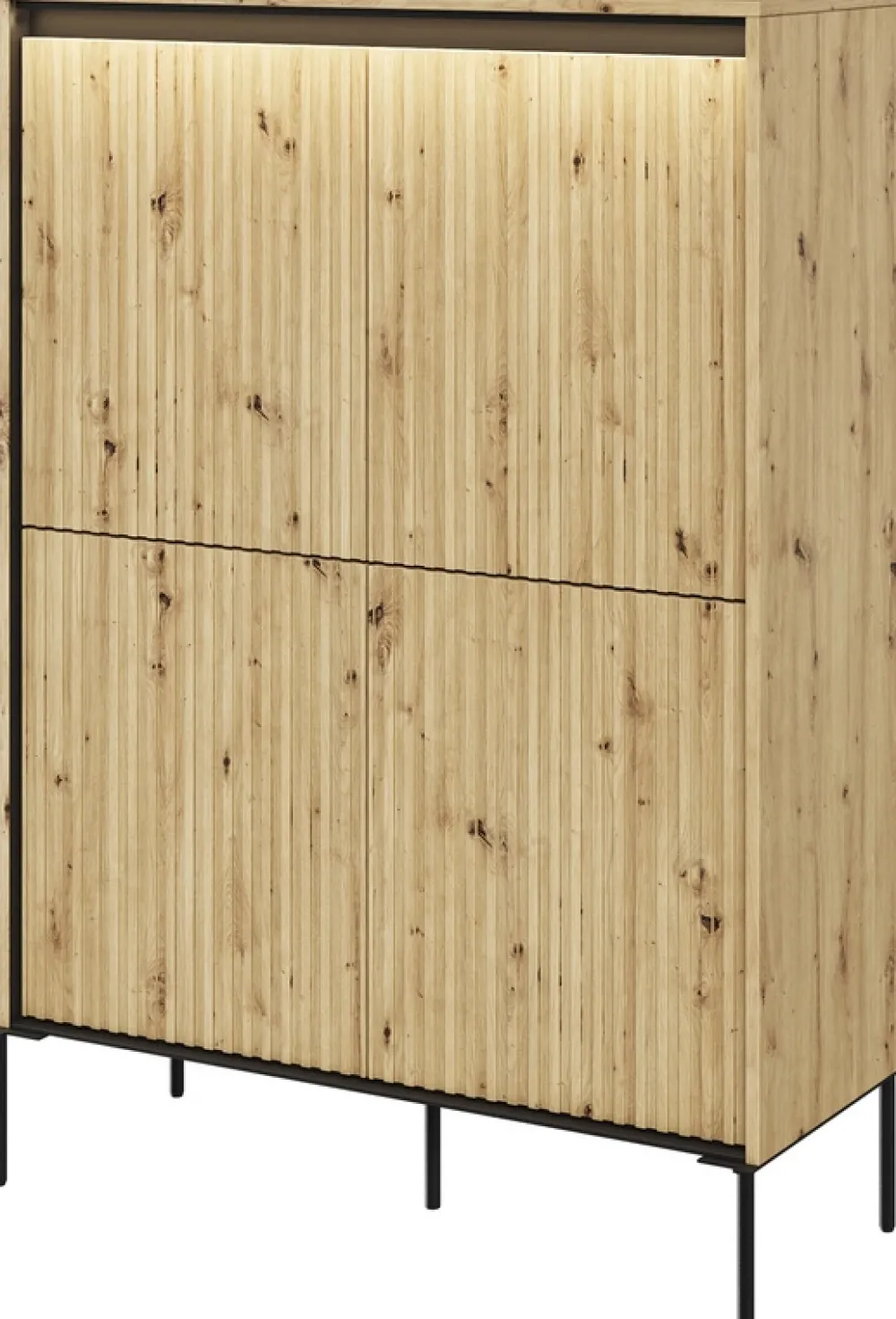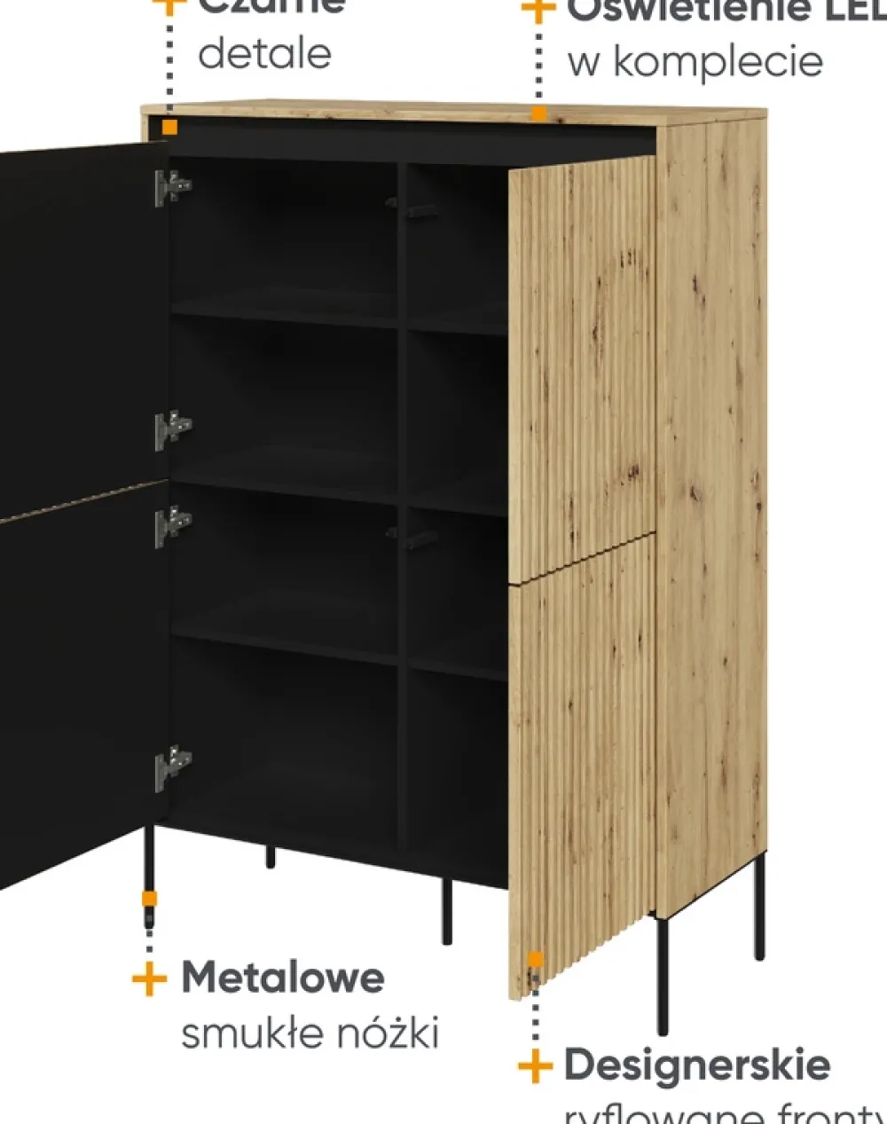 Komoda wyposażona jest w oświetlenie LED klasy A++, co zapewnia efektywność energetyczną i przemyślaną, przytulną atmosferę. Światło LED subtelnie podkreśla wyjątkowy kolor dębu artisan, eksponując każdy element wzoru na frontach.