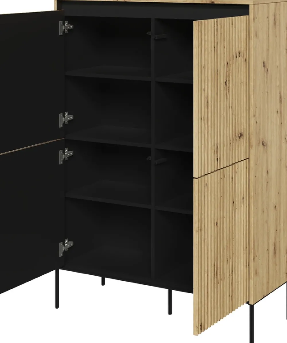 Odkryj wyrafinowaną elegancję z naszą czterodrzwiową komodą TREND w kolorze dąb artisan. Frezowane fronty, wykonane z precyzją i dbałością o najdrobniejsze szczegóły, w subtelnym prostym wzorze dodają meblowi unikalnej, głębi, wprowadzając do Twojego wnętrza nutę naturalnej elegancji.