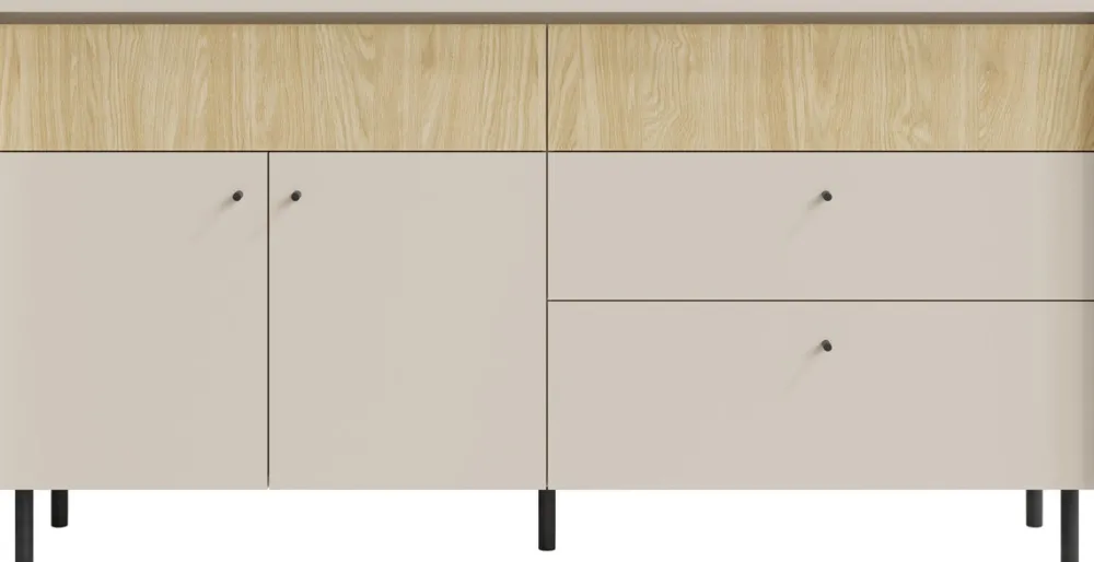 Komoda do salonu MALIVO o szerokości 163,5 cm to harmonijne połączenie nowoczesnej estetyki z codzienną funkcjonalnością. Jasny beż piaskowy i ciepły dąb olejowany tworzą naturalny duet, który wprowadza do wnętrza przytulność i elegancję. Cztery pojemne szuflady oraz dwie szafki z półkami zapewniają komfortowe przechowywanie, a wysokie, czarne nóżki i uchwyty dodają całości loftowego charakteru.