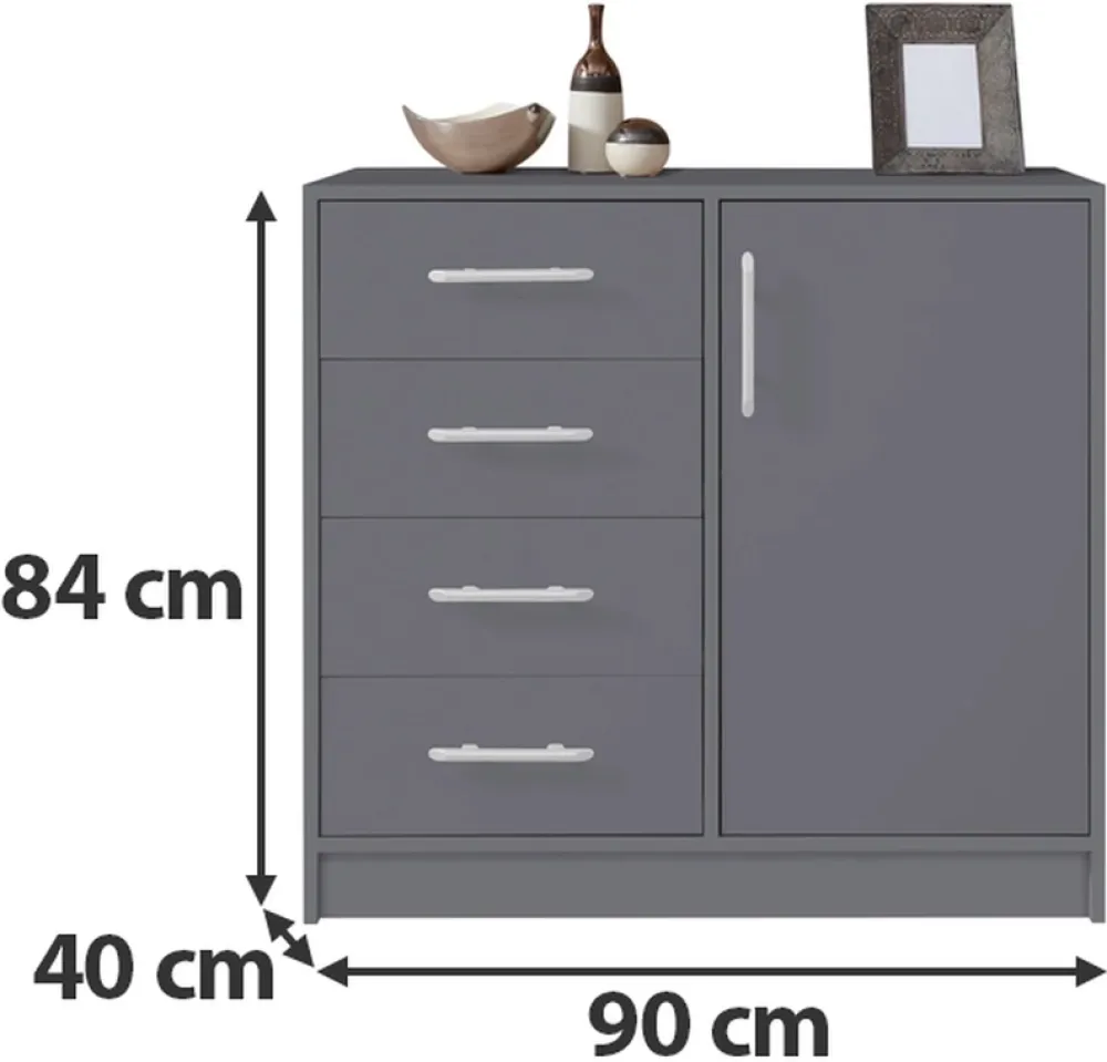 - Komoda SEVAS została wyposażona w cztery szuflady umieszczone po lewej stronie oraz drzwi, za którymi znajduje się półka po prawej stronie. Komoda dzięki nowoczesnej stylistyce doskonale wpisuje się we współczesne aranżacje pomieszczeń.