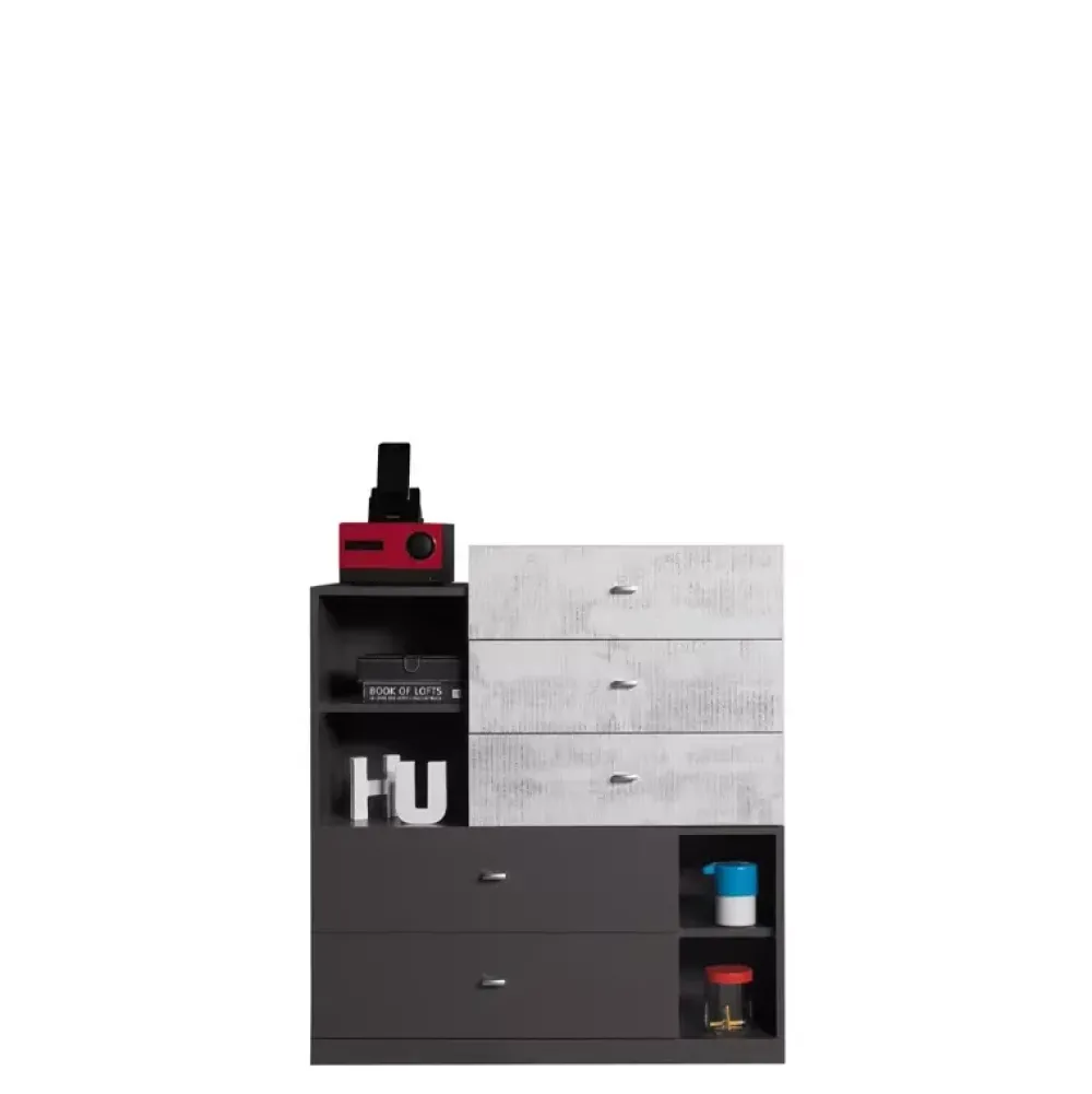 - Pojemna komoda do pokoju młodzieżowego z pięcioma szufladami w trzech kolorach. Wyposażona w kilka otwartych wnęk.