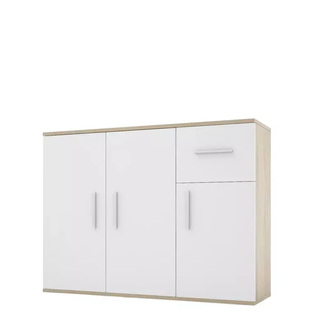 Trzydrzwiowa komoda o szerokości 112 cm z szufladą sprawdzi się w Twoim mieszkaniu. Białe meble cieszą się popularnością ze względu na uniwersalność i świeżość, a także swobodę w wyborze dodatków. Korpus w kolorze dąb sonoma doda oryginalności.