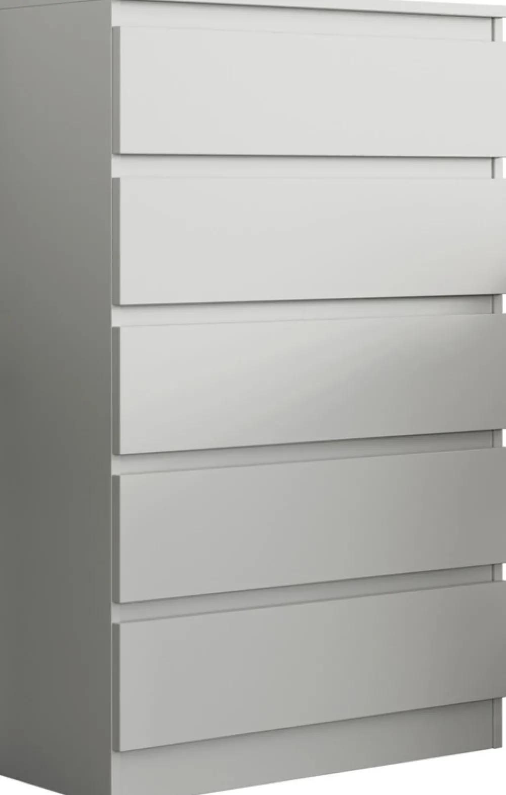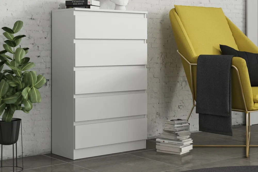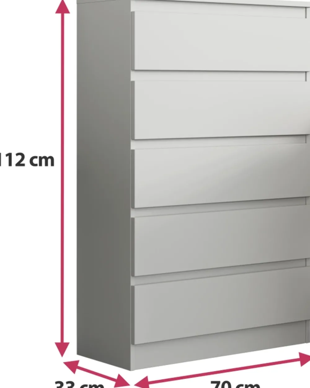 - Komoda posiada pięć pojemnych szuflad, które poruszają się na prowadnicach rolkowych, zapewniając gładkie i bezgłośne wysuwanie.