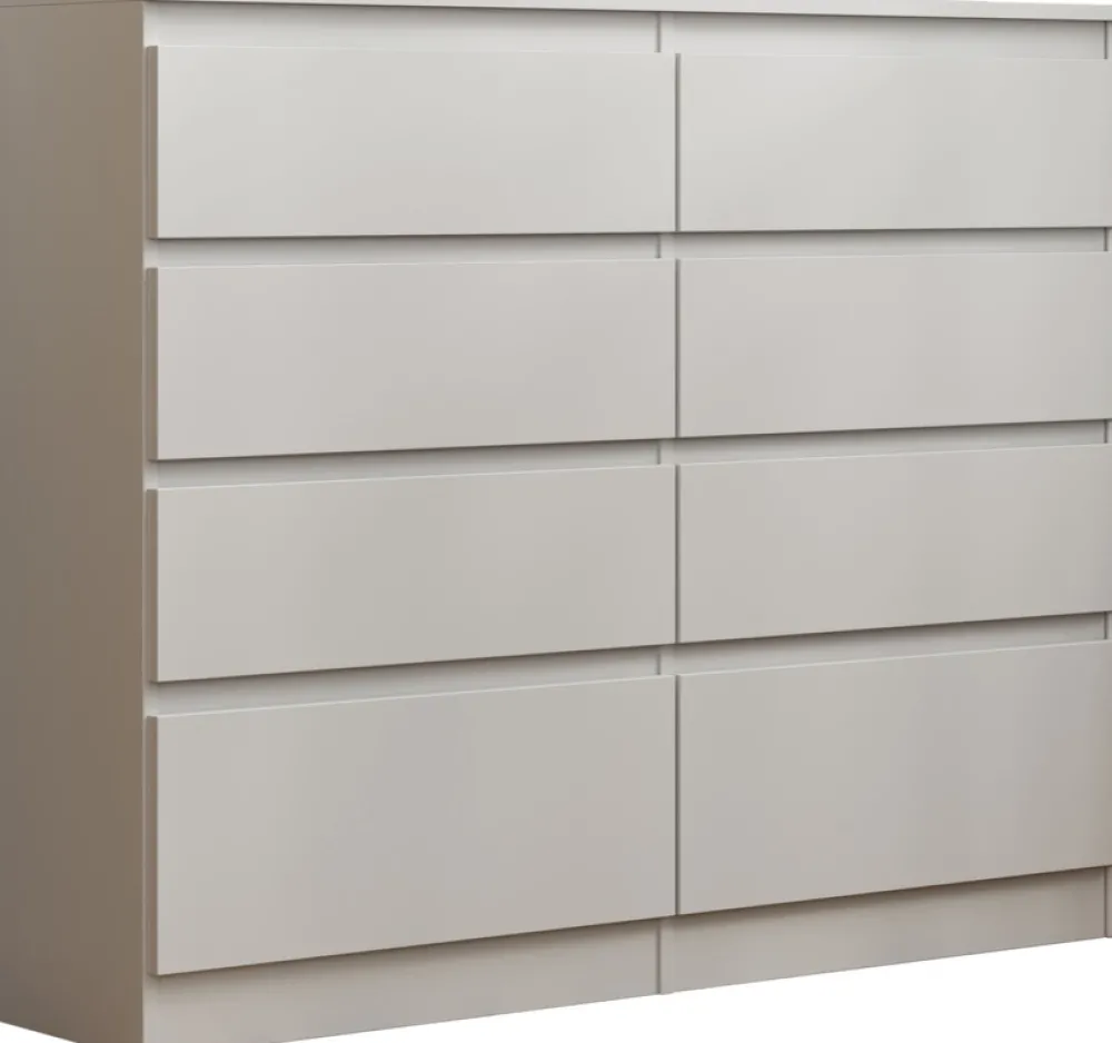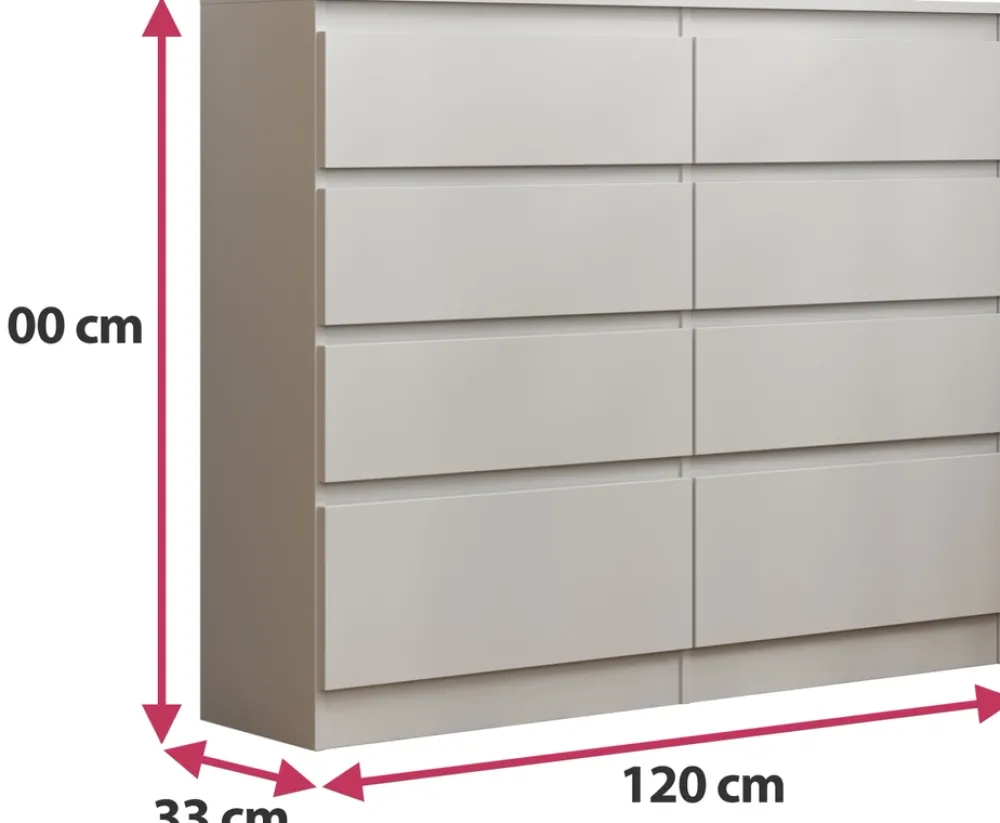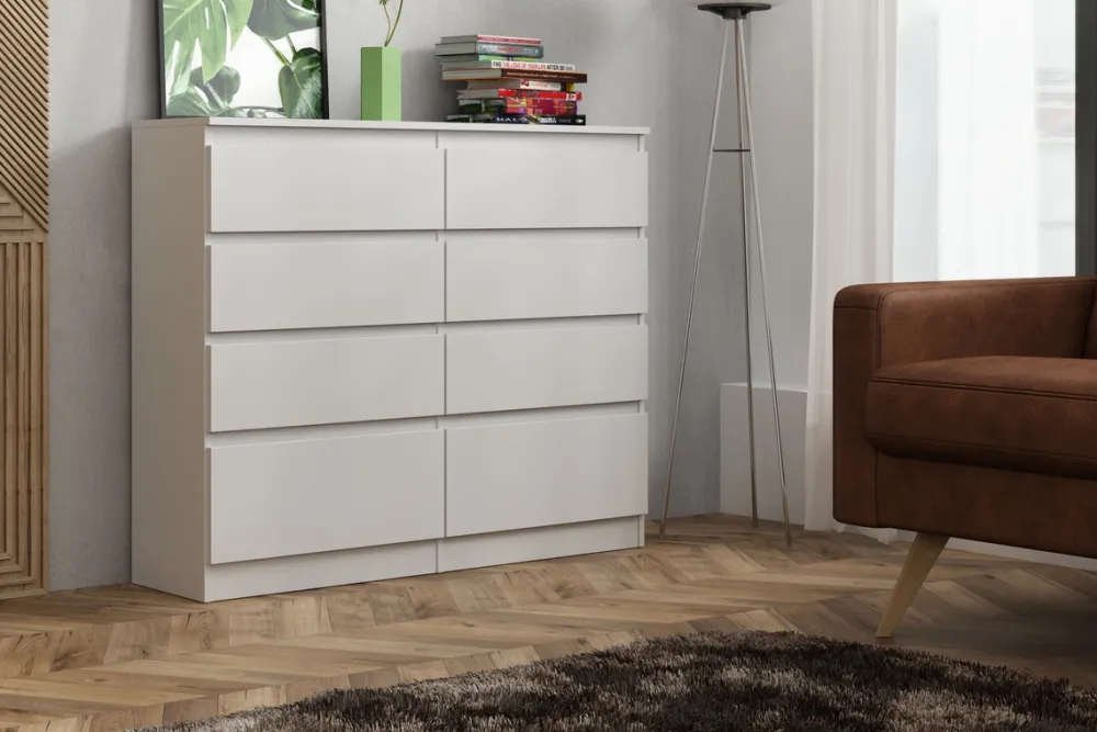 - Komoda posiada osiem pojemnych szuflad, które poruszają się na prowadnicach rolkowych, zapewniając gładkie i bezgłośne wysuwanie.