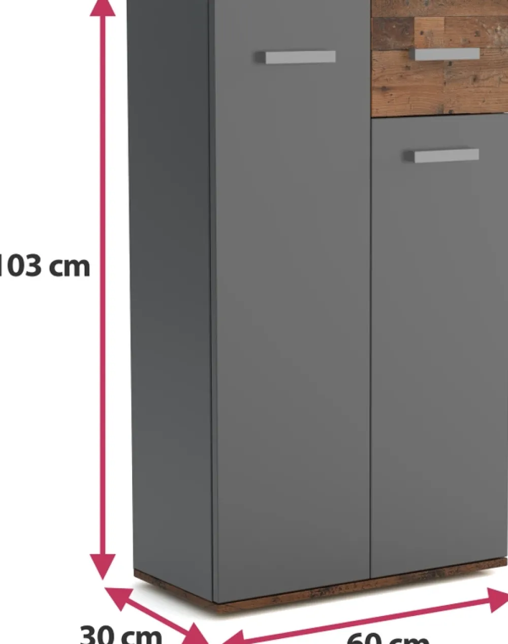 Komoda do przedpokoju JOVITA to doskonałe rozwiązanie dla osób, które cenią sobie porządek oraz stylowy wygląd wnętrza. Model wyposażony jest w dwoje drzwi, za którymi znajdują się pojemne półki – idealne miejsce do przechowywania butów, akcesoriów i innych niezbędnych przedmiotów. Dzięki temu Twoje rzeczy będą zawsze na swoim miejscu, a przedpokój pozostanie schludny i zorganizowany.
