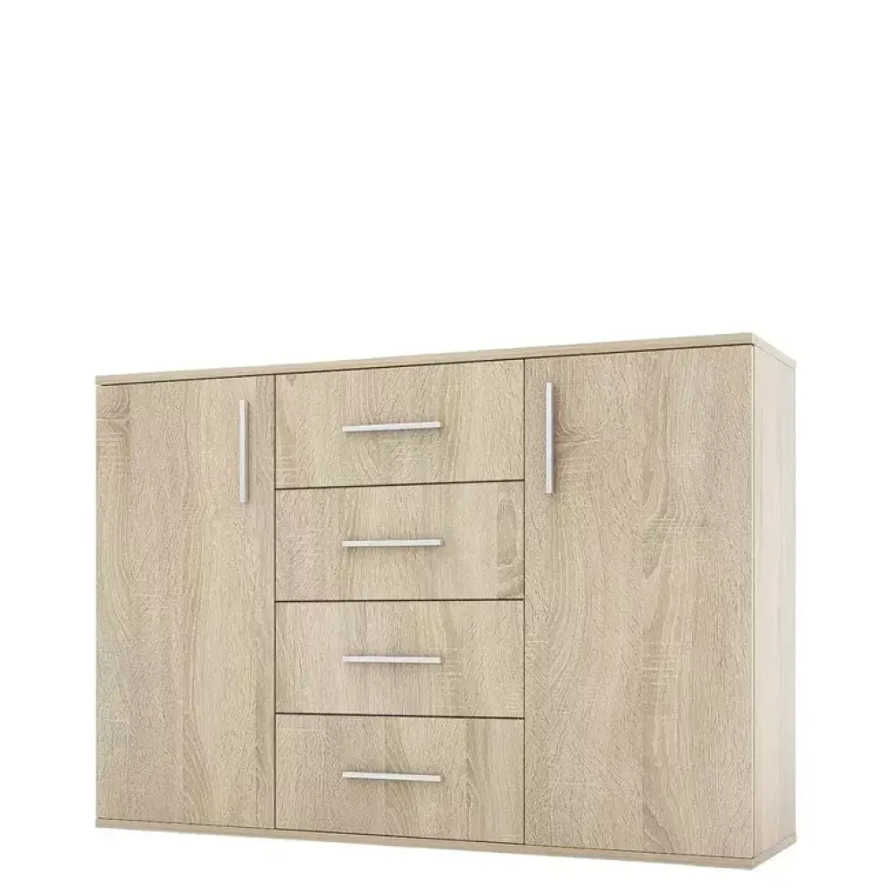 Dwudrzwiowa komoda o szerokości 112 cm z czterema pojemnymi szufladami sprawdzi się w Twoim mieszkaniu. Kolor dąb sonoma cieszy się popularnością, ponieważ nie widać na nim zarysowań czy zabrudzeń.